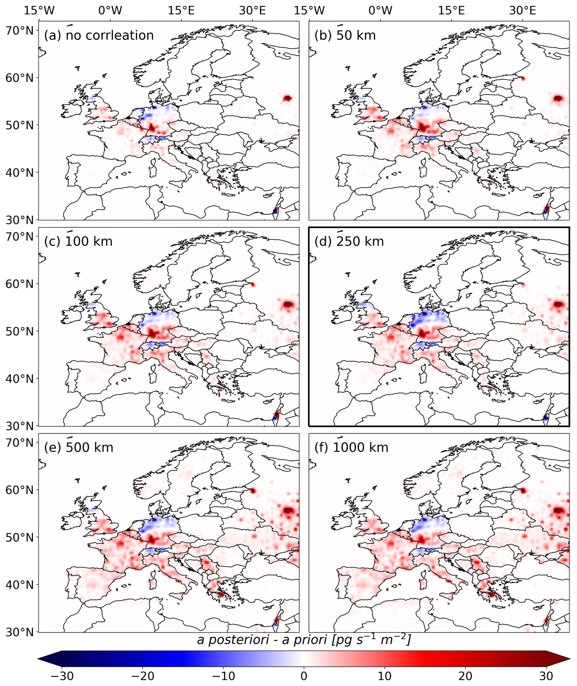 • spatial a priori emission uncertainty correlations: FLEXINVERT+ uses an exponential decay function to account for spatial emission uncertainty correlations. We test different spatial scale lengths of 50, 100, 250, 500, 1000 km, as well as a setup with no spatial correlation.