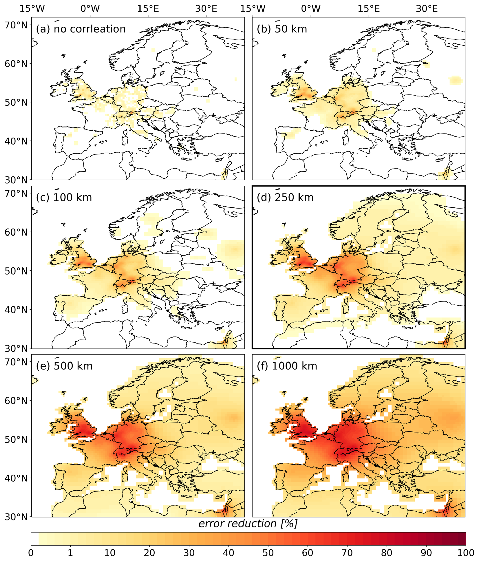 Consistent with the distribution of emission sensitivities (Fig. 2), the largest error reductions (Fig. 4b) are concentrated in central Europe, particularly in well-monitored countries such as the UK, Germany, and Switzerland. Additional areas with notable error reduction include northwestern France and northernmost Italy, Moscow and Israel. Notice that the elevated error reductions in Moscow and Israel are likely a consequence of the relatively high a priori uncertainties in these regions, which give the algorithm more flexibility to adjust emissions. However, since these areas are poorly covered by the observation network, the a posteriori emissions may still be considered unreliable despite the notable error reduction.