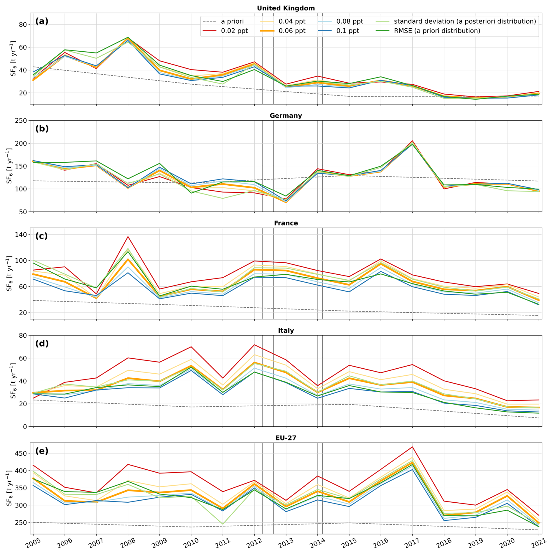 Figure 3 shows the seven generated European a priori emission fields averaged across the study period from 2005 to 2021. Overall, these emission fields display a relatively similar spatial pattern, especially when compared to the significantly larger differences observed in the global patterns of the bottom-up SF6 inventories (see Vojta et al.2024). All European inventories show high SF6 emissions in central Europe, with Germany being the largest emitter. Notably, a priori emissions are particularly high in western Germany, especially in the area around Cologne. The EDGAR and UNFCCC inventories also highlight substantial emissions in Berlin, which are less prominent in the GAINS inventories. In France, the UNFCCC and EDGAR inventories concentrate emissions in the Paris region, whereas GAINS indicates more dispersed emissions. For the UK, all inventories show the highest emissions in London, with elevated values also occurring in other large cities such as Liverpool, Manchester, and Birmingham. In Italy, the EDGAR inventories estimate higher a priori emissions compared to those from GAINS and UNFCCC. Substantial emissions occur also in the Moscow region, particularly for the EDGAR- and GAINS-based inventories. A detailed discussion on the differences among the a priori inventories and their influence on inversion results are provided in Appendix B.