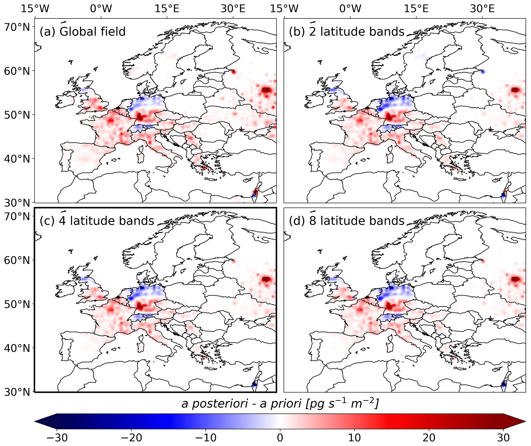 Figure 4c reveals particularly high emissions in southwestern Germany, aligning with the findings of Simmonds et al. (2018), who also reported an emission maximum in this region. We also obtain elevated emissions in southern UK, northern and southeastern France, and northern Italy. A posteriori emissions are also high in Moscow and Israel, which, however, show large a posteriori uncertainties, despite the notable uncertainty reductions there (Fig. 4d). As discussed in the Appendix B, the Russian a posteriori emissions are highly sensitive to the choice of a priori emissions, leading to unstable results. In the following sections, we therefore focus on the high-emitting European countries with better observational coverage: the UK, Germany, France, and Italy.