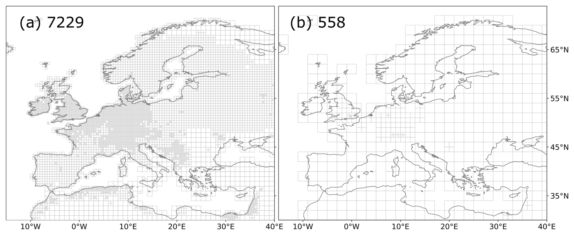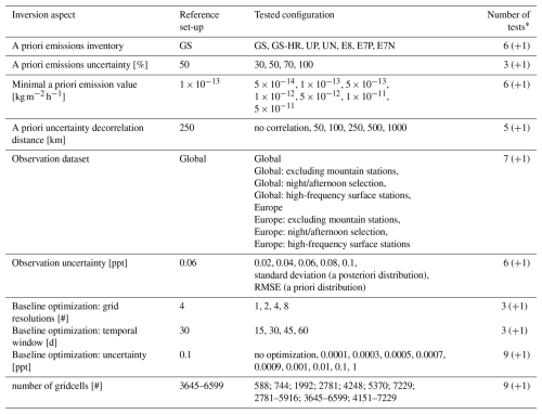 • emission grid: We use emission grids with varying cell sizes, determined by aggregating cells with low emission contributions based on emission sensitivities and a priori emissions (for further details, see Thompson and Stohl2014). We test grid configurations with 588, 744, 1992, 2781, 4248, 5370, and 7229 cells, each configuration kept constant over time. Additionally, we implement three dynamic setups where the grid configuration changes each year, with the number of cells ranging from (i) 2781 to 5916, (ii) 3645 to 6599, and (iii) 4151 to 7229.