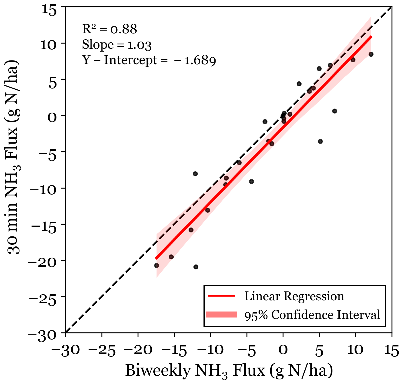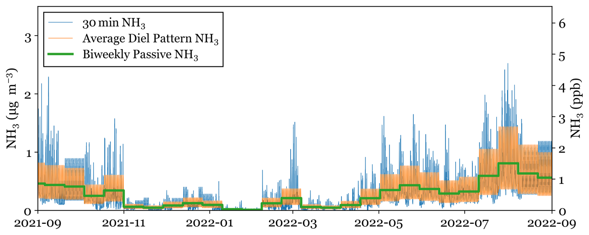 Biweekly NH3 ambient air concentration was measured using Radiello passive diffusion samplers purchased from Sigma Aldrich. The Radiello sampling system includes a diffusive body (part number: RAD1201) and an adsorbing cartridge (part number: RAD168) coated with phosphoric acid. NH3(g) diffuses across the exterior diffusive body and is collected on the adsorbing cartridge as ammonium (NH4+) over two weeks. Collected ammonia (as NH4+) is extracted from the cartridge into deionized water and analyzed on a cation IC using a 20 mM methanesulfonic acid eluent (0.5 mL min−1) on a Dionex CS12A ion exchange column with a CSRS ULTRA II suppressor and Dionex conductivity detector (Li et al., 2016). NH3 passive samples were collected in duplicate (σ=±0.25µg m−3) on top of the NEON tower (25.35 m a.g.l.). Across the study period, there were 27 sampling periods. Due to site access issues, some samples had durations longer than 2 weeks. To create a consistent dataset, all data were aggregated to a 2-week average. In the case where two samples overlapped during a 2-week period, they were combined using a weighted average. One sample was below the detection limit and was removed from this analysis. Passive NH3 sampling methods have been shown to have a low bias when compared with other sampling methods, including annular denuders and Picarro Cavity Ringdown spectroscopy methods (Puchalski et al., 2011; Pan et al., 2020).