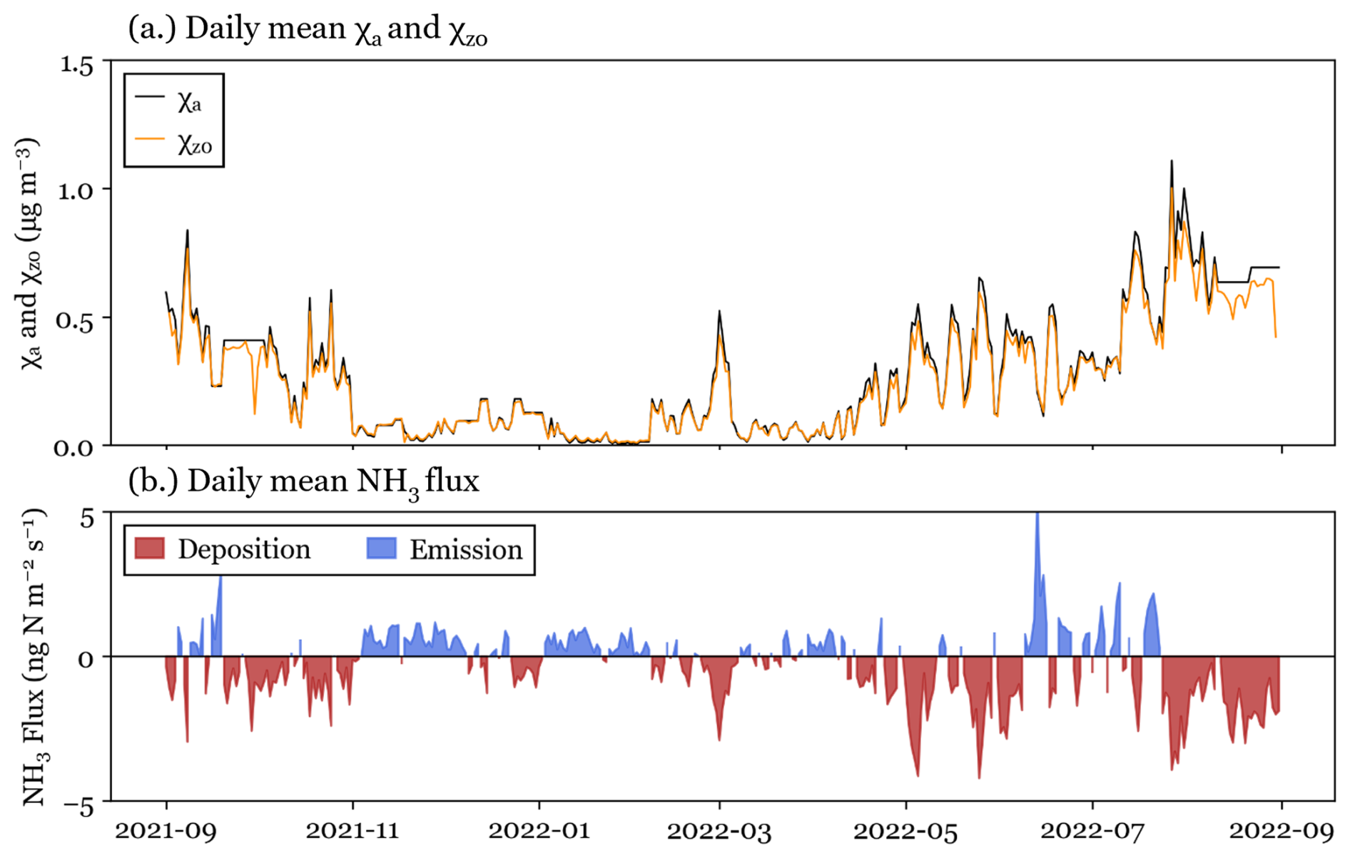 Figure 4Daily mean values of: (a) Daily mean χa and χz0, and (b) NH3 flux.