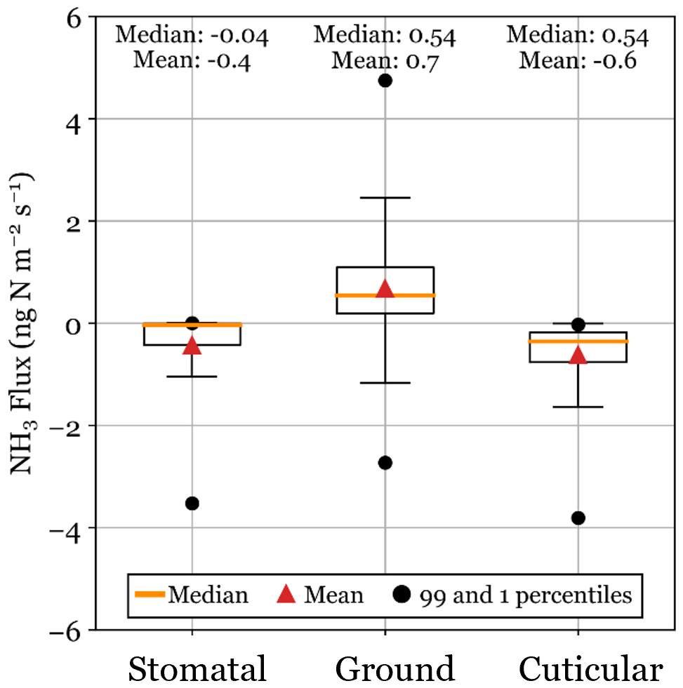 Total modeled NH3 flux can be broken down into stomatal, ground, and cuticular fluxes. Figure 5 shows the distribution of simulated NH3 fluxes for each of these components.