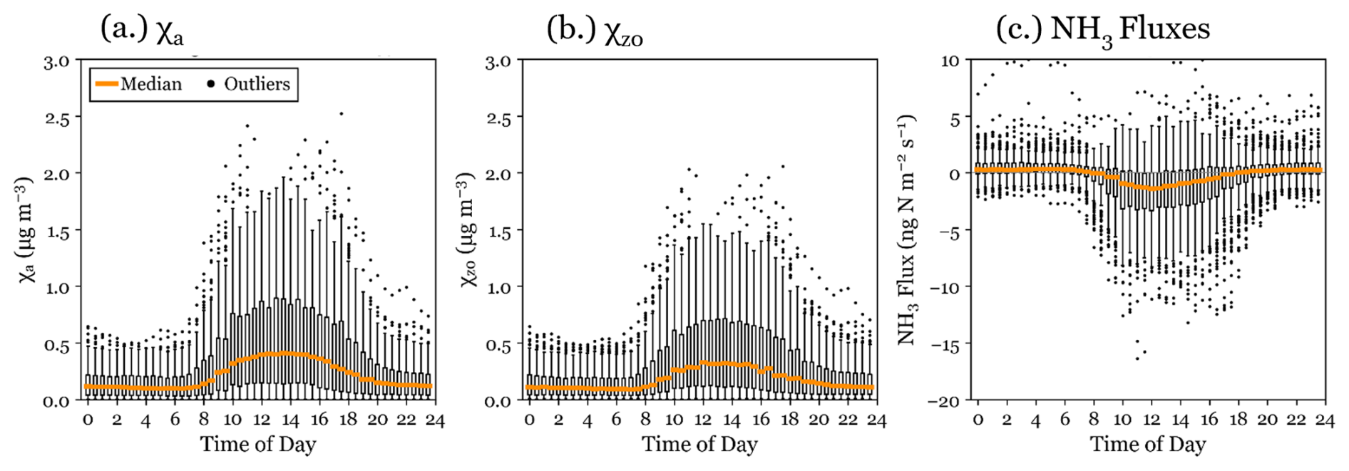 At RMNP, a diel pattern in ambient NH3 concentrations has commonly been observed in past measurements. This pattern is primarily driven by changes in transport patterns that carry NH3 emissions to the park (Benedict et al., 2013b; Juncosa Calahorrano et al., 2024) and, sometimes, modified by changes in the atmosphere-surface exchange of NH3, especially during NH3 uptake and emission from dew formation and evaporation (Wentworth et al., 2016).