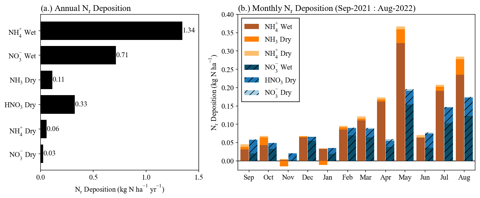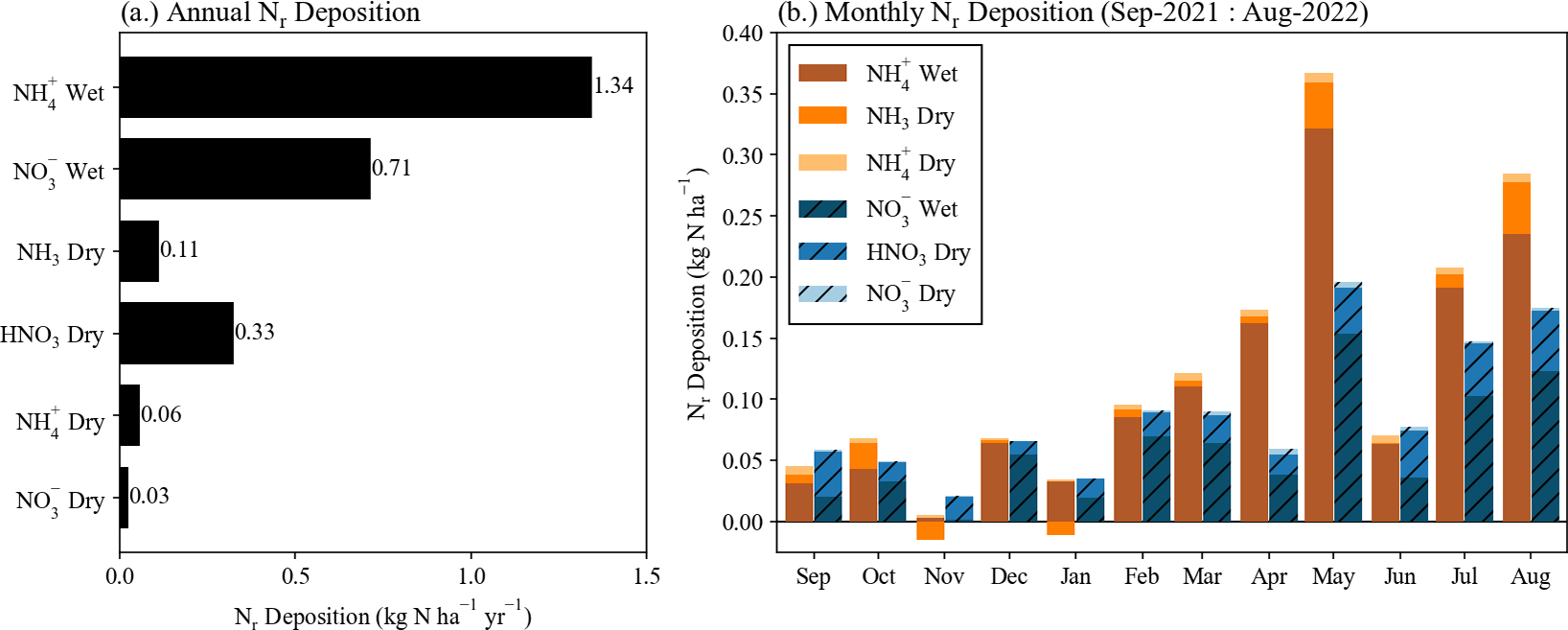 As a result of effective NOx emission controls, the balance of Nr wet deposition across the US has shifted from oxidized N-dominated to reduced N-dominated, and dry deposition of NH3 at times dominates total Nr deposition (Li et al., 2016; Walker et al., 2019a; Driscoll et al., 2024). The National Emission Inventory (NEI) indicates that US NOx emissions were reduced by 46 % between 2013 and 2023, while NH3 emissions increased by 13 % (U.S. EPA, 2023).