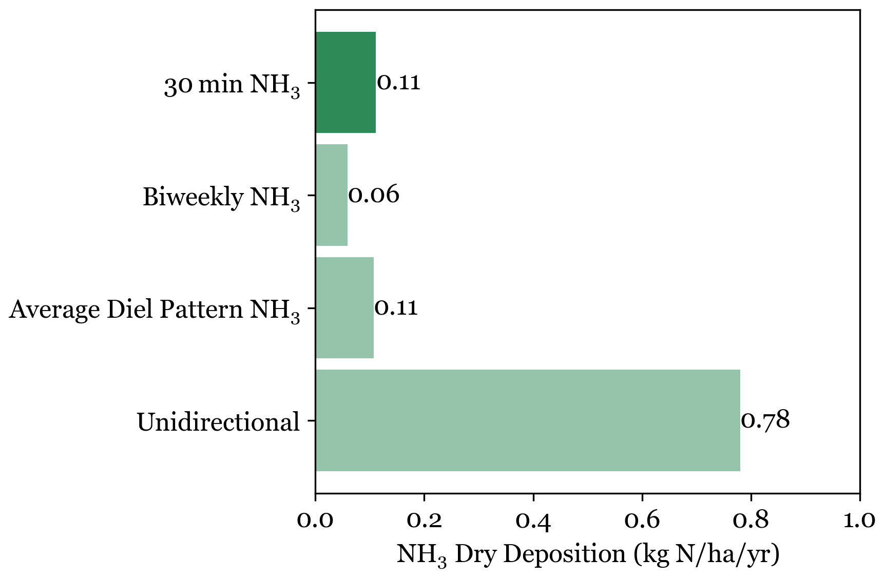 The contribution of ammonia atmosphere-surface exchange to excess deposition of reactive nitrogen is poorly understood. Reactive nitrogen deposition has negative impacts on ecosystem health. Ammonia can be difficult and expensive to measure. We demonstrate that depositions modeled using low-cost measurements underestimate ecosystem inputs but can be corrected using typical daily concentration cycles. We also illustrate the limitations of reanalysis meteorology for ammonia deposition modeling.