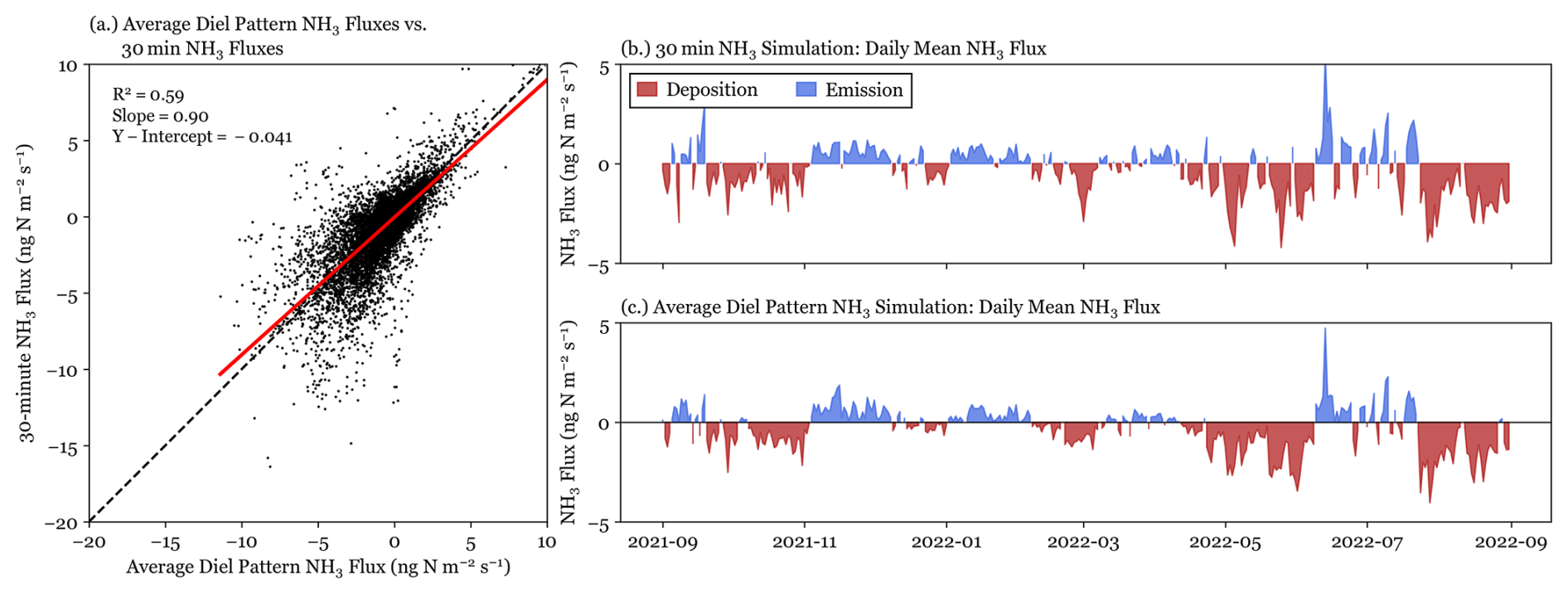 The ammonia concentration data used in the study is available at DOI: https://doi.org/10.5061/dryad.0cfxpnwcw (Naimie et al., 2025). The NEON flux tower eddy covariance data bundle is available at: https://data.neonscience.org/data-products/DP4.00200.001 (last access: 4 June 2025). ERA5 reanalysis data is available at: https://www.ecmwf.int/en/forecasts/dataset/ecmwf-reanalysis-v5 (last access: 27 February 2024). CASTNET data are available at: https://www.epa.gov/castnet/download-data (last access: 24 November 2024). NTN data are available at: https://nadp.slh.wisc.edu/networks/national-trends-network/ (last access: 31 May 2024).