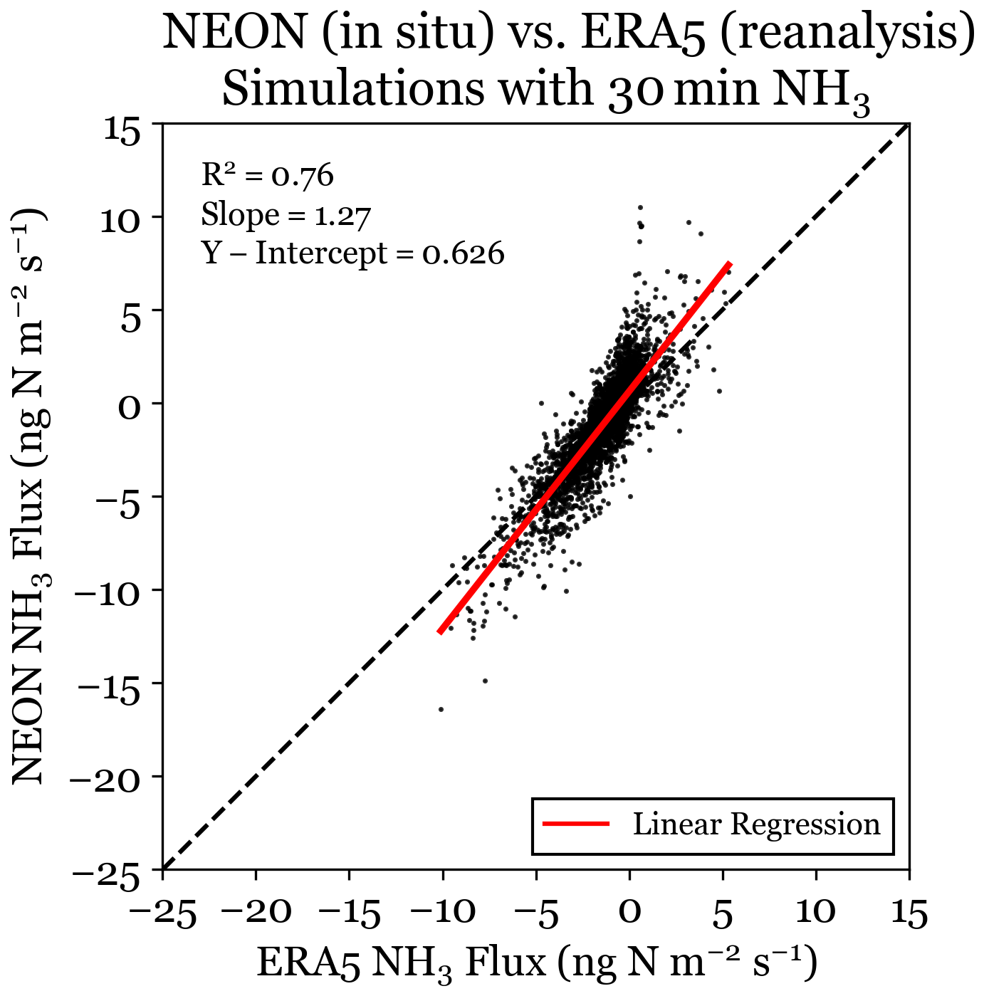 Figure 11Bidirectional NH3 flux simulated with ERA5 meteorology and NEON meteorology at 30 min resolution using the 30 min NH3 concentration. The least squares linear regression is plotted for the data in red.