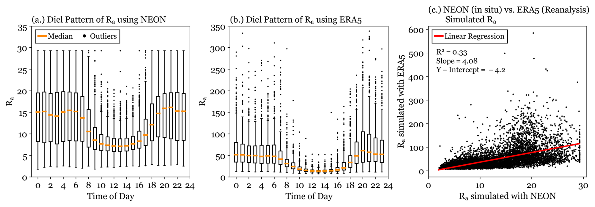 Figure 12Aerodynamic resistances are shown for simulations using in situ meteorological data from the NEON flux tower and reanalysis meteorological data from ERA5. The diel patterns are shown in (a) and (b), respectively. Panel (c) directly compares simulated Ra values using NEON in situ and ERA5 reanalysis data.