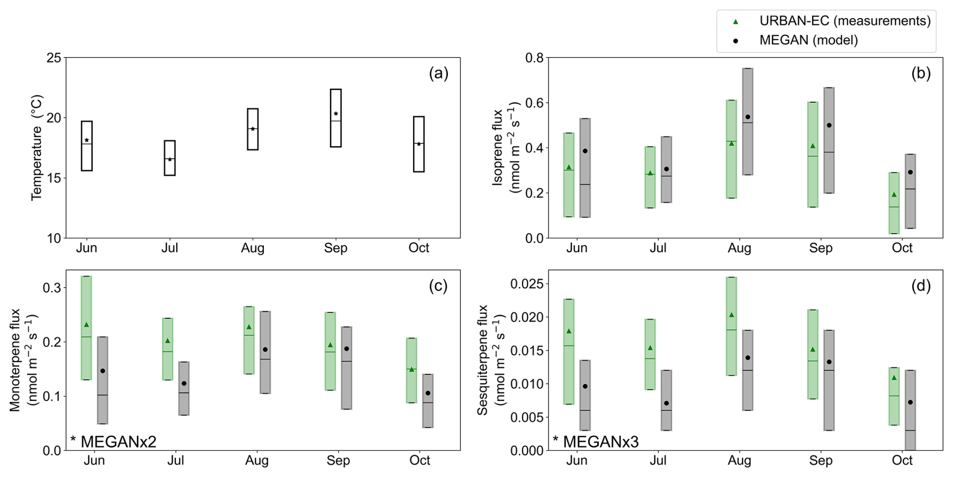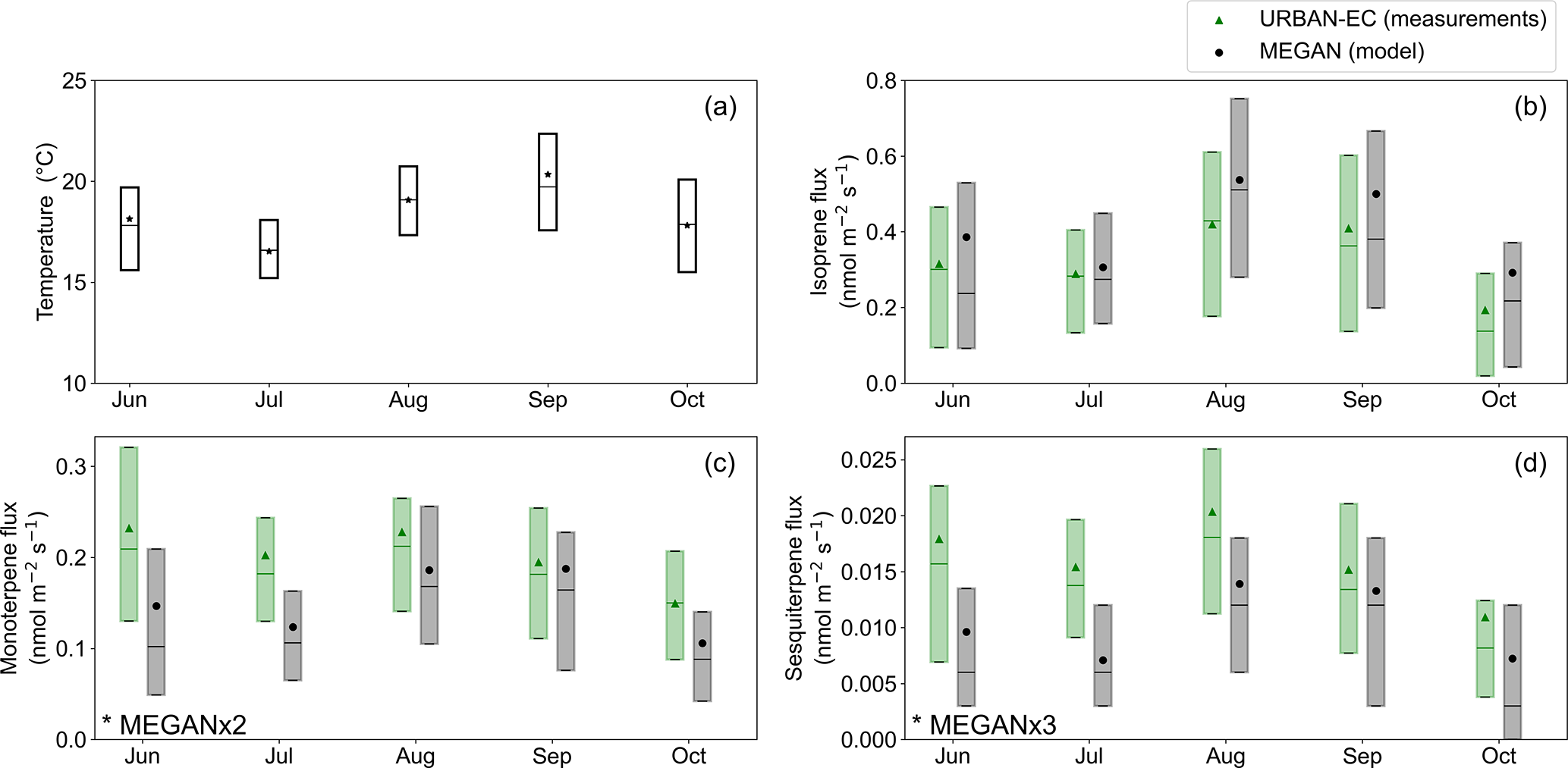 Figure 1Daytime monthly statistics for (a) temperature, (b) isoprene flux, (c) monoterpene flux, and (d) sesquiterpene flux. Boxes represent the interquartile range, horizontal lines in the box represent the medians, and icons (stars, triangles, circles) represent the means. Shaded green boxes represent the measurements (URBAN-EC), and shaded grey boxes represent the biogenic emissions model (MEGAN). Note that for panels (c) and (d), MEGAN fluxes are scaled by a factor of 2 and 3, respectively.