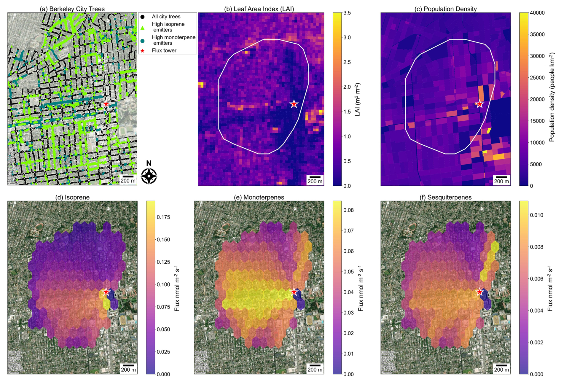 Figure 2(a) Location of Berkeley city trees with high isoprene and monoterpene emitters indicated, (b) June leaf area index, (c) block scale population density, and 80 % footprint-weighted flux maps for (d) isoprene, (e) monoterpenes, and (f) sesquiterpenes. The URBAN-EC flux tower is represented by the red star icon. Each panel displays the same geographic area. The 80 % footprint is shown in (b) and (c) as the white trace. Map base layer is open source from ESRI World Imagery.