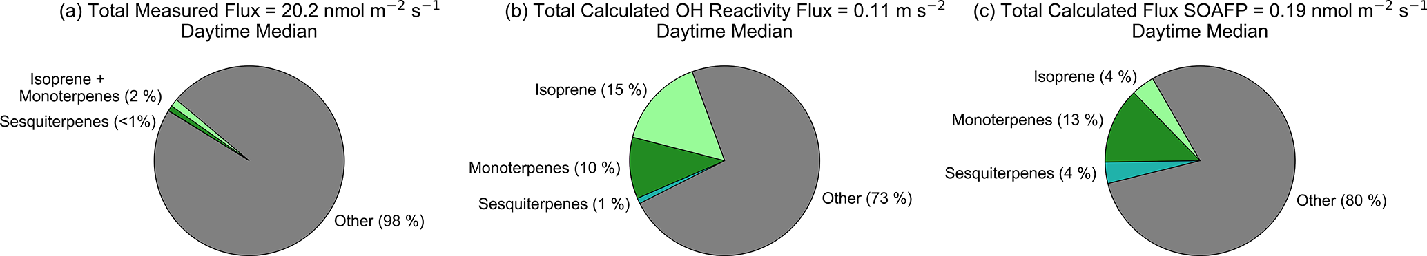 Figure 3Isoprene, monoterpene, and sesquiterpene fraction of the total measured (a) molar VOC flux, (b) calculated OH reactivity flux, and (c) calculated secondary organic aerosol formation potential (SOAFP) flux. The results shown represent the daytime median values (06:00–21:00). Percentages may not add up to 100 due to rounding.