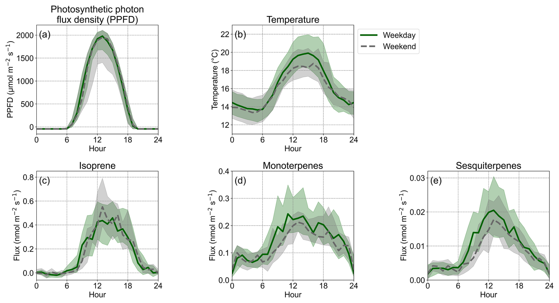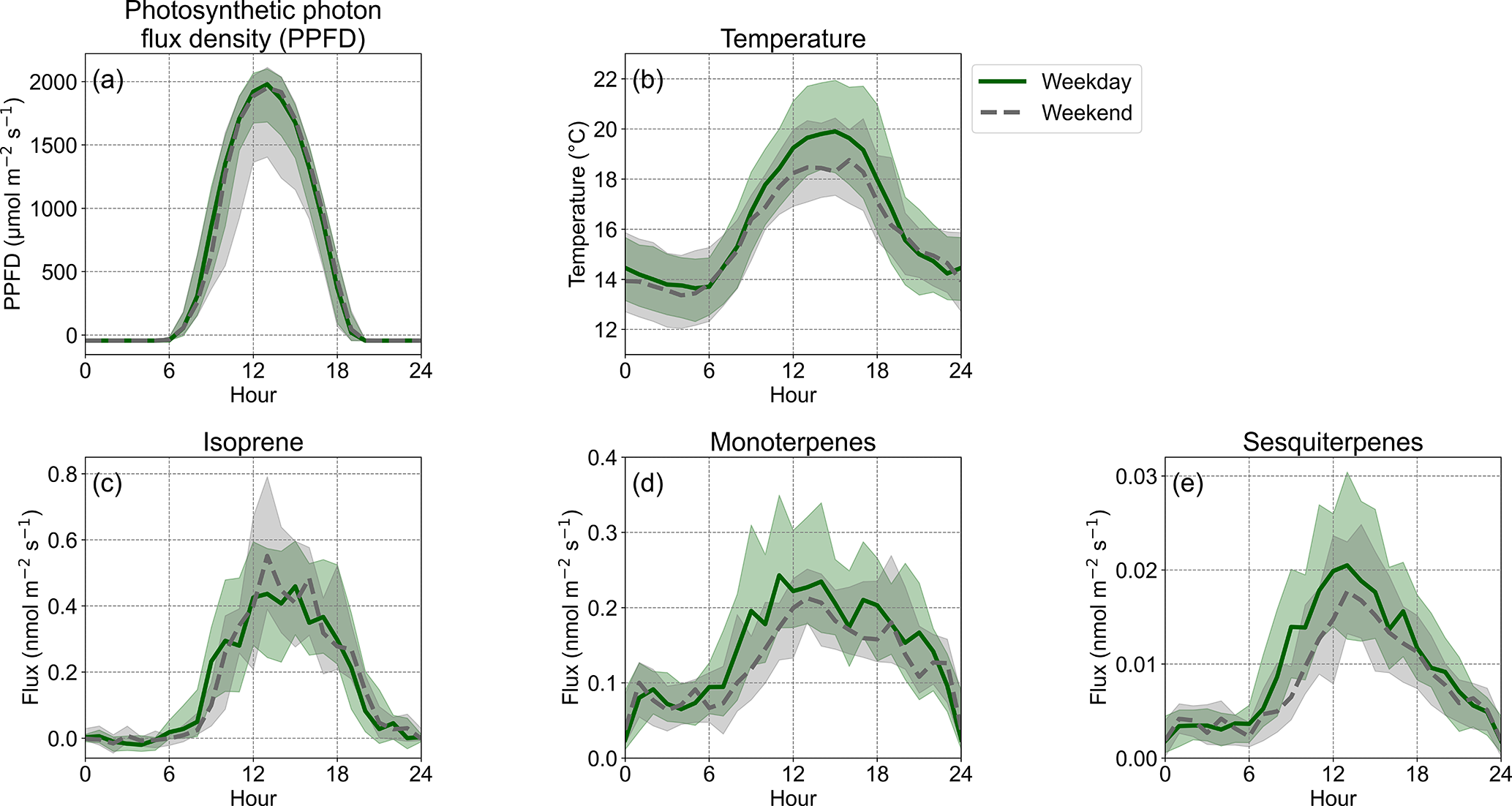 Figure 4Diurnal (a) photosynthetic photon flux density (PPFD), (b) temperature, and fluxes of (c) isoprene, (d) monoterpenes, and (e) sesquiterpenes. Data are split by weekday (green solid lines) and weekend (grey dashed lines). Lines represent the median and the shaded region represents the interquartile range for each hour.