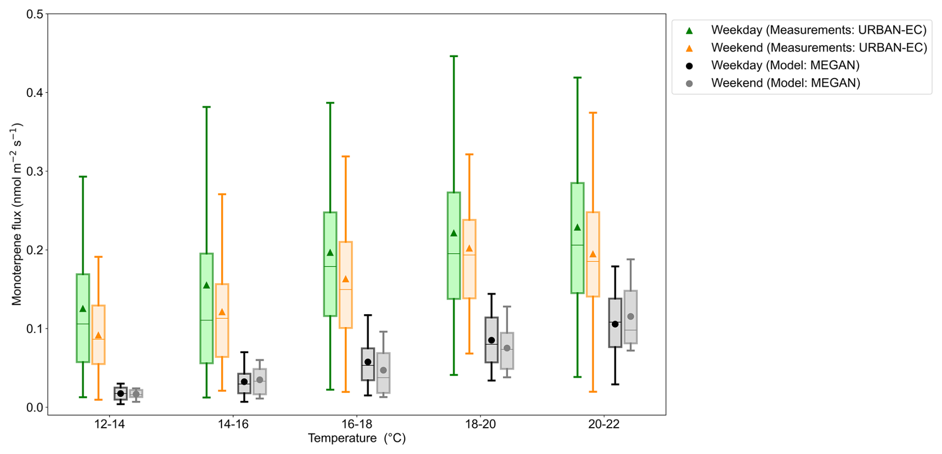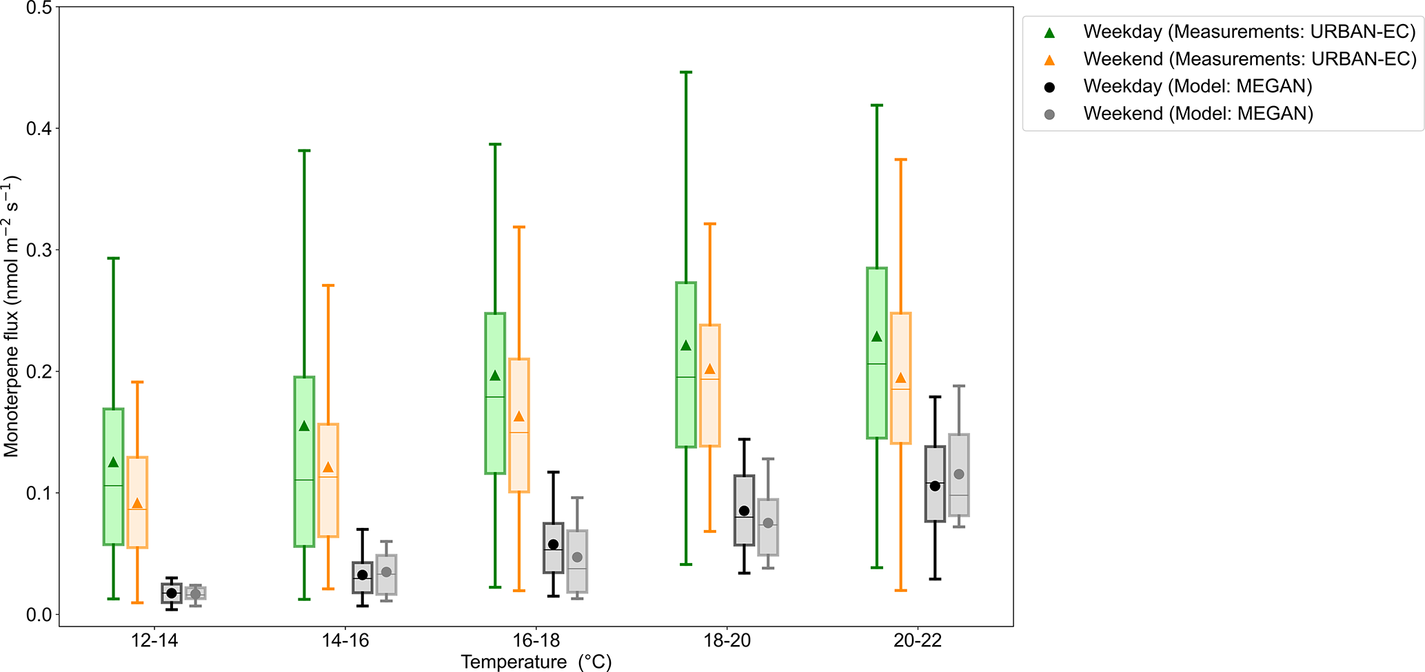 Figure 5Measured (URBAN-EC) and modeled (MEGAN) monoterpene fluxes binned by temperature. Each bin spans 2 °C. Data are split into weekday and weekend fluxes. Boxes are plotted against the midpoint temperature of each bin with an offset for clarity. Triangle (URBAN-EC) and circle (MEGAN) icons represent the means, boxes represent the interquartile ranges, horizontal lines in the boxes represent the medians, and capped vertical lines represent the 5th and 95th percentiles. Data are averaged so that MEGAN and URBAN-EC fluxes are at the same time resolution (1 h), and only time periods where both datasets are available are included for a direct comparison (hours from 05:00 to 18:00).
