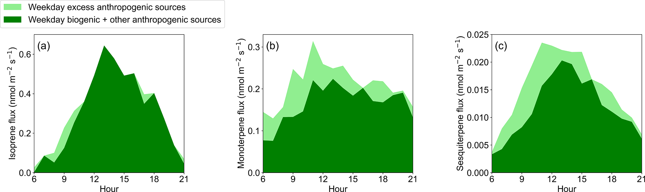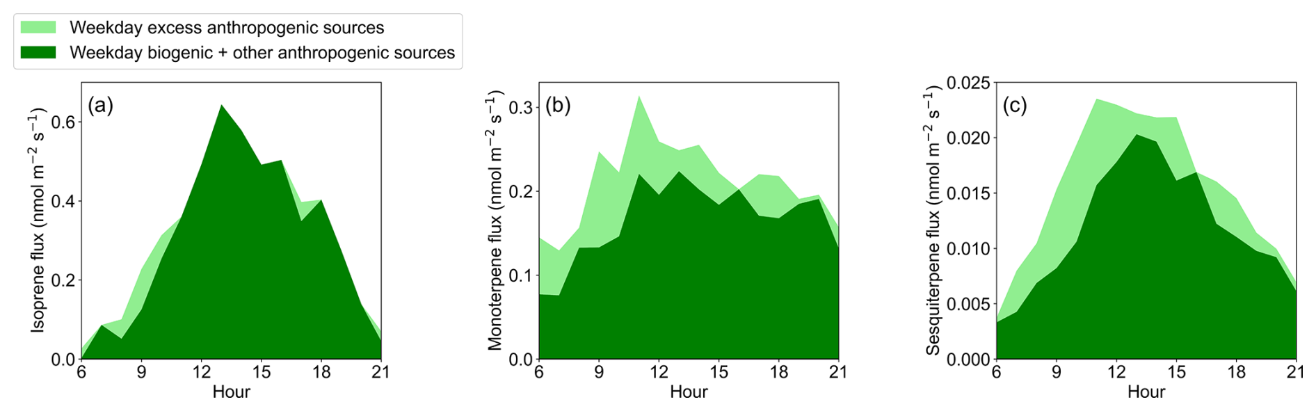 Unlike monoterpenes and sesquiterpenes, the weekday excess anthropogenic fraction of isoprene emissions is close to zero. Figure 6 shows that there could be a small contribution from weekday excess sources of isoprene in the morning and around 17:00, consistent with higher traffic times. Sesquiterpene trends will be discussed in the next section.