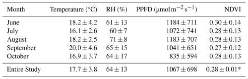 Table 1Average ± standard deviation of daytime (06:00–21:00) temperature, relative humidity (RH), photosynthetic photon flux density (PPFD), and footprint average ± standard deviation Normalized Difference Vegetation Index (NDVI) for each full month of flux data available and the entire study duration.