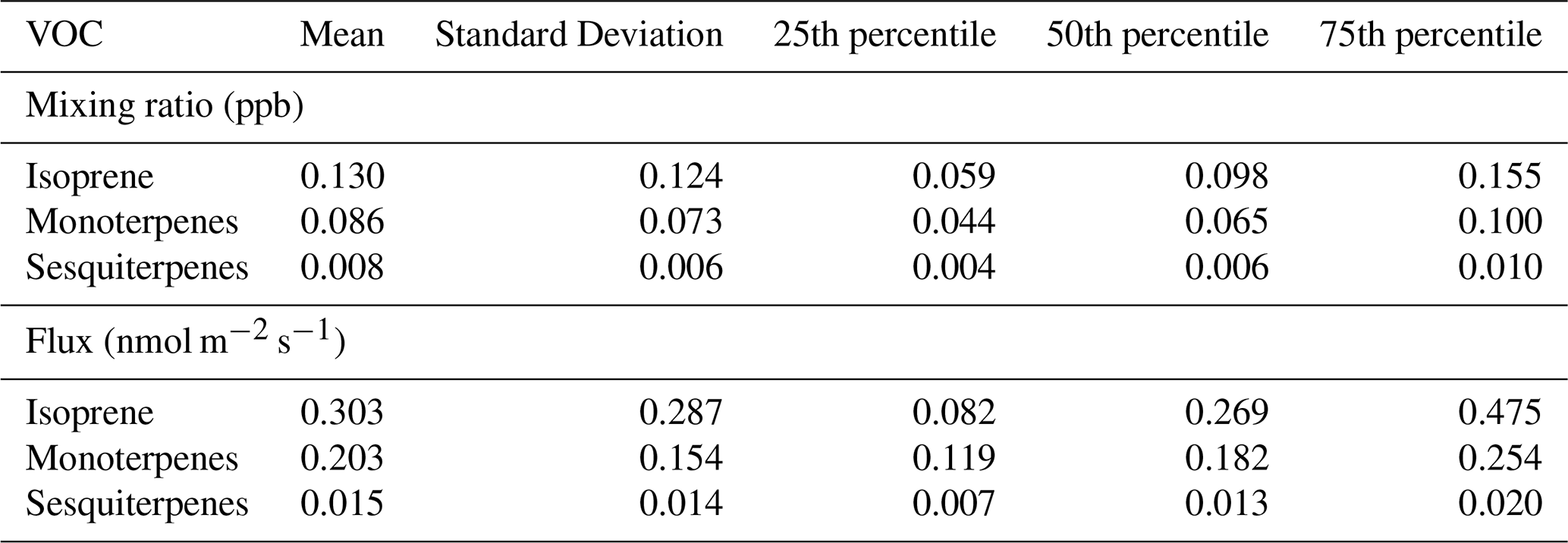Table 2Daytime flux and mixing ratio statistics for isoprene, monoterpenes, and sesquiterpenes. 25th, 50th, and 75th percentiles are shown with the mean and standard deviation.