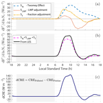 Figure 3Composite diurnal cycle of: (a) the susceptibility terms SN, SLWP, Sf from Eqs. (7)–(9), calculated offline using the differences between the N200 and N25 simulations, and (b) their sum (magenta) compared against the actual LES model output (black) from Eq. (10). Panel (c) shows the diurnal cycle of dCRE (with CRE shown in Fig. 2e).