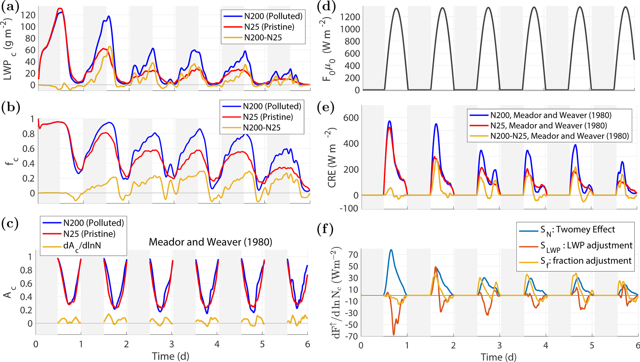 Figure 2Six diurnal cycles of (a) cloud liquid water path (LWPc) and its difference between the polluted and pristine cases, (b) cloud fraction and its difference between the polluted and pristine cases, (c) cloud albedo calculated following Meador and Weaver (1980) and its difference between the polluted and pristine cases, (d) incoming solar shortwave energy flux, (e) cloud radiative effect, and its difference between the polluted and pristine cases, and (f) the susceptibility of shortwave outgoing radiation to droplet number concentration decomposed into the three parts: Twomey effect (Eq. 7), LWP adjustment (Eq. 8), and cloud fraction adjustment (Eq. 9).