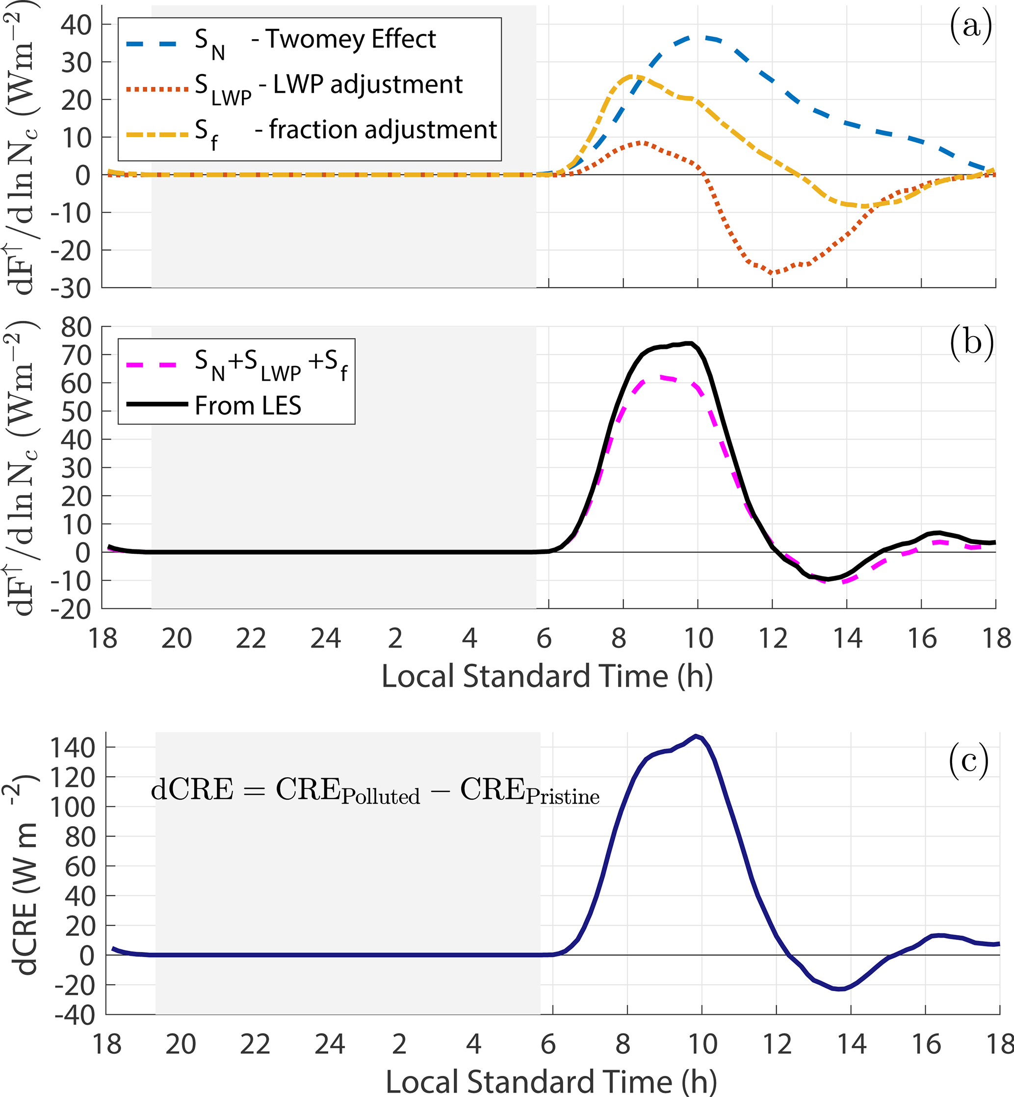 Figure 3 shows a composite diurnal cycle of the ERFACI averaged over the six-day trajectory. Here panel (a) shows the three individual terms that determine the ERFACI, calculated from Eqs. (7)–(9). The Twomey effect (SN) is always positive with a peak in the late morning. The timing of this peak in SN results from a combination of the fact that sensitivity is maximum for Ac=0.5 (Platnick and Twomey, 1994) and of the fact that morning hours have larger fc than afternoon hours, so that the Twomey effect has less leverage in the afternoon than in the morning. The other two cloud adjustment terms (SLWP and Sf) exhibit similar diurnal patterns, with positive values in the morning and negative values in the afternoon, which over the course of the diurnal cycle partially cancel the Twomey effect. Panel (b) shows the total ERFACI, which is largely positive in the morning and approximately zero in the afternoon. Note that the sum of the three partial contributions from panel (a), approximately calculated using Eqs. (7)–(9), agrees well with the total adjustment directly calculated from the LES as the difference in F↑ between the purely polluted and pristine cases: