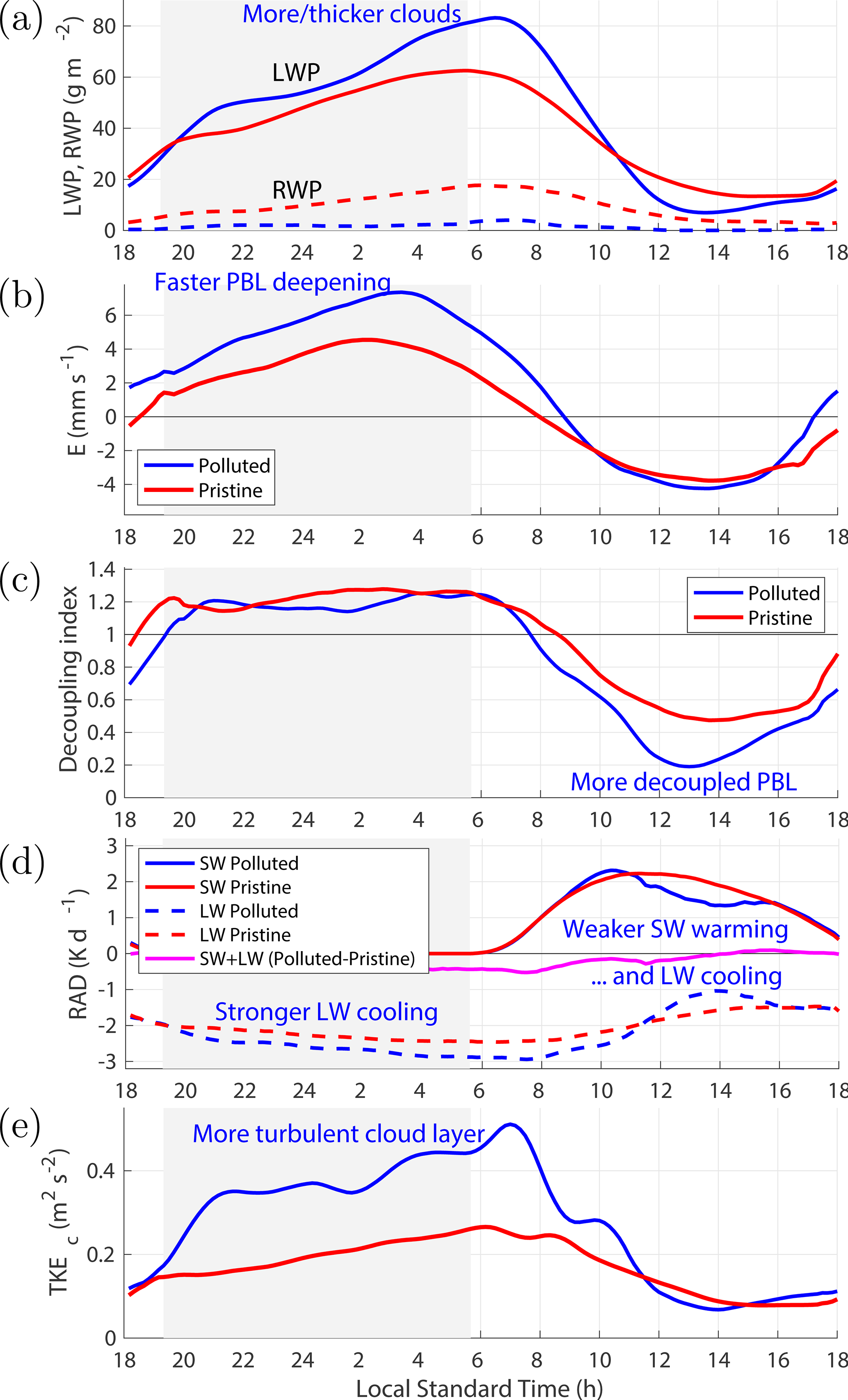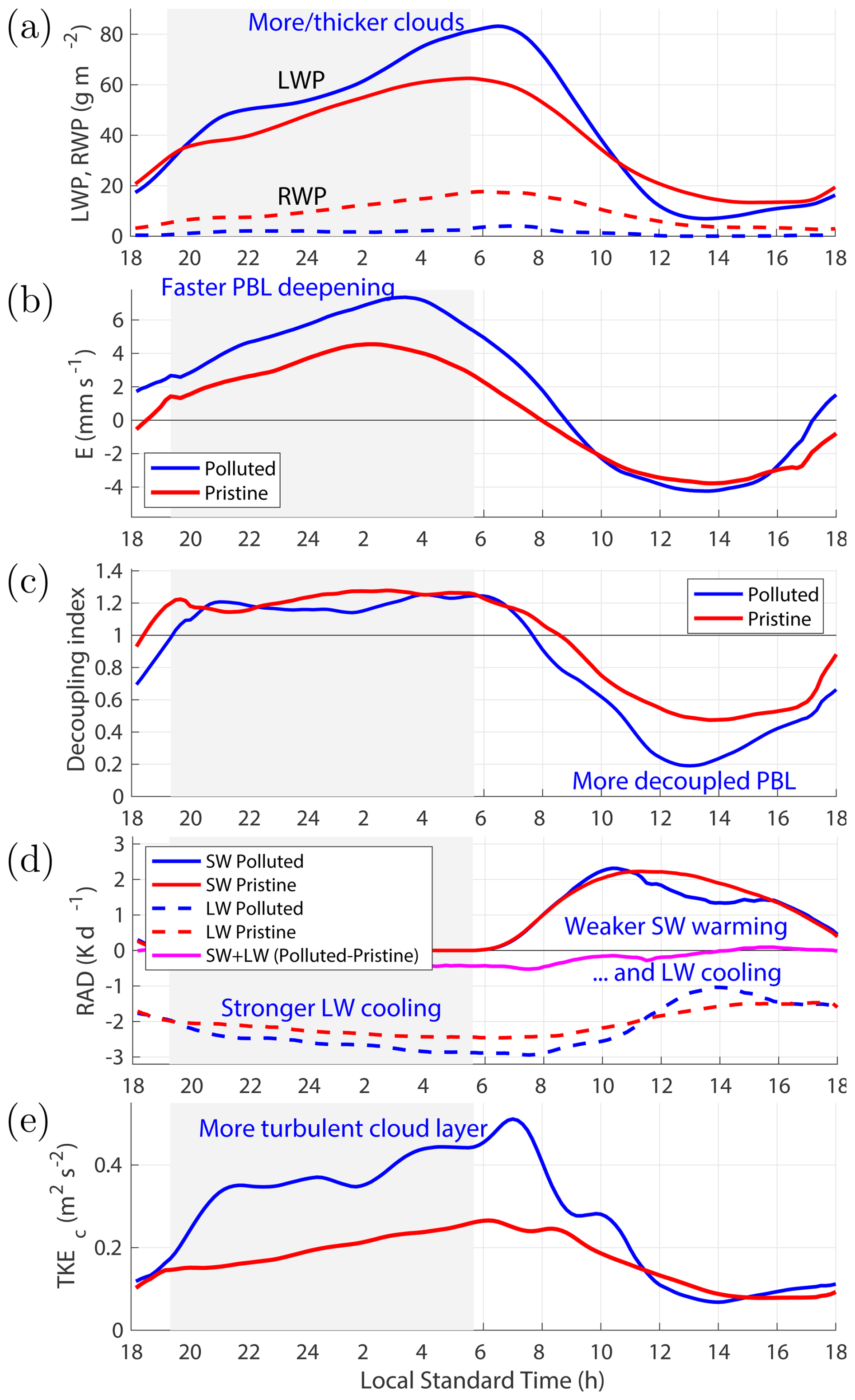 Why does the diurnal pattern in ERFACI seen in Fig. 3 emerge? To demonstrate the relevant mechanisms, Fig. 4 presents a composite diurnal comparison of the cloudy boundary layer structure for the pristine and polluted scenarios. The polluted scenario produces less precipitation than the pristine scenario at all hours of the day (panel a). The polluted cloud entrains more efficiently and grows deeper than the pristine cloud over night (panel b). The polluted cloud is substantially more turbulent than the pristine cloud over night (panel e). Panel (d) shows that while the changes in cloud LWP affect the radiative heating of the cloud layer, the afternoon differences in the shortwave warming are nearly exactly canceled by the differences in the longwave cooling. The resultant difference in radiative heating is primarily due to an overnight increases in longwave cooling of the polluted case. While both clouds are well coupled to the surface fluxes over night, the polluted cloud becomes substantially less coupled than the pristine cloud throughout the sunlit hours (panel c). The decoupling index is defined here as the ratio of the moisture flux at cloud base to that near the surface (van der Dussen et al., 2013), providing a measure of how much of the surface flux reaches the cloud layer.