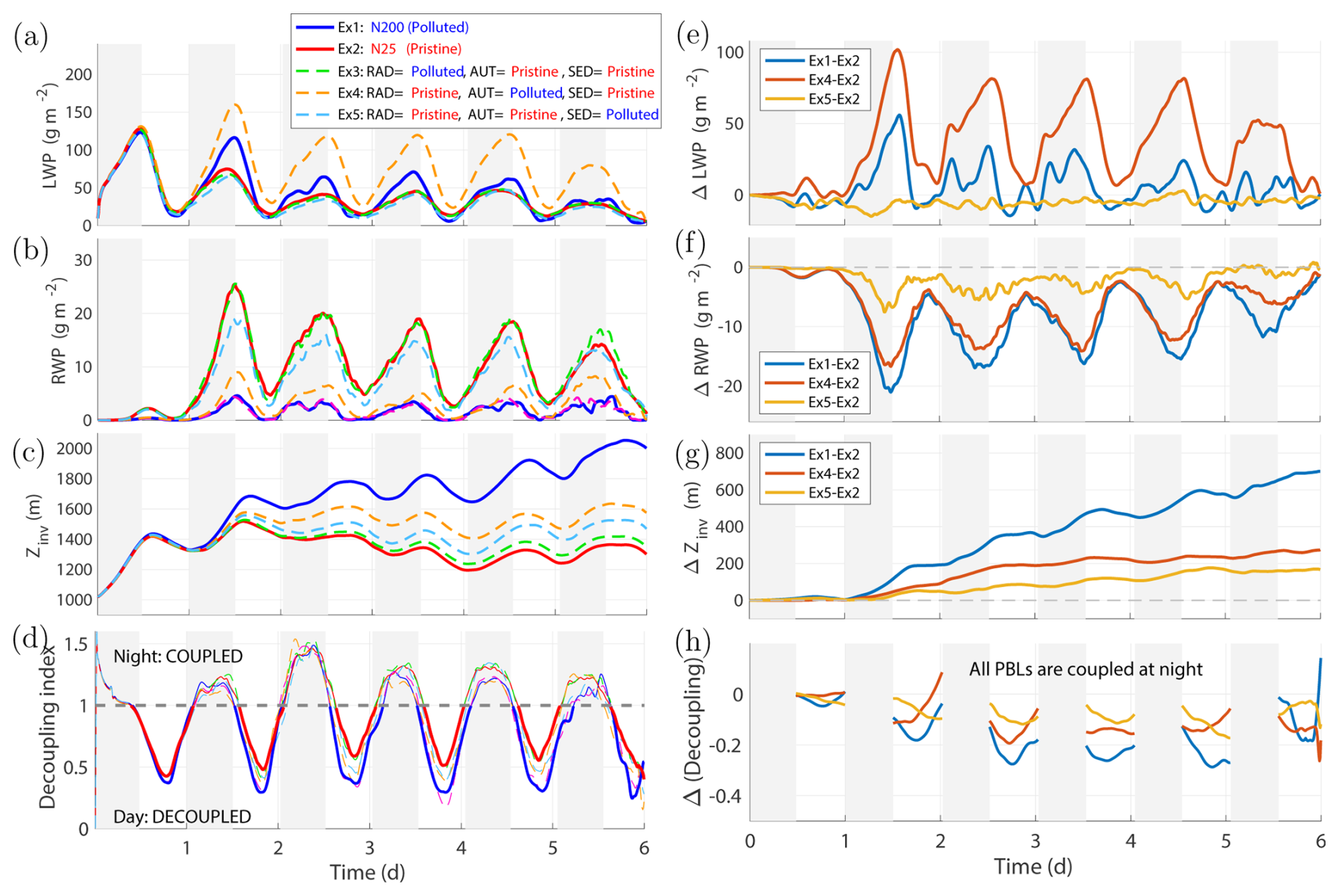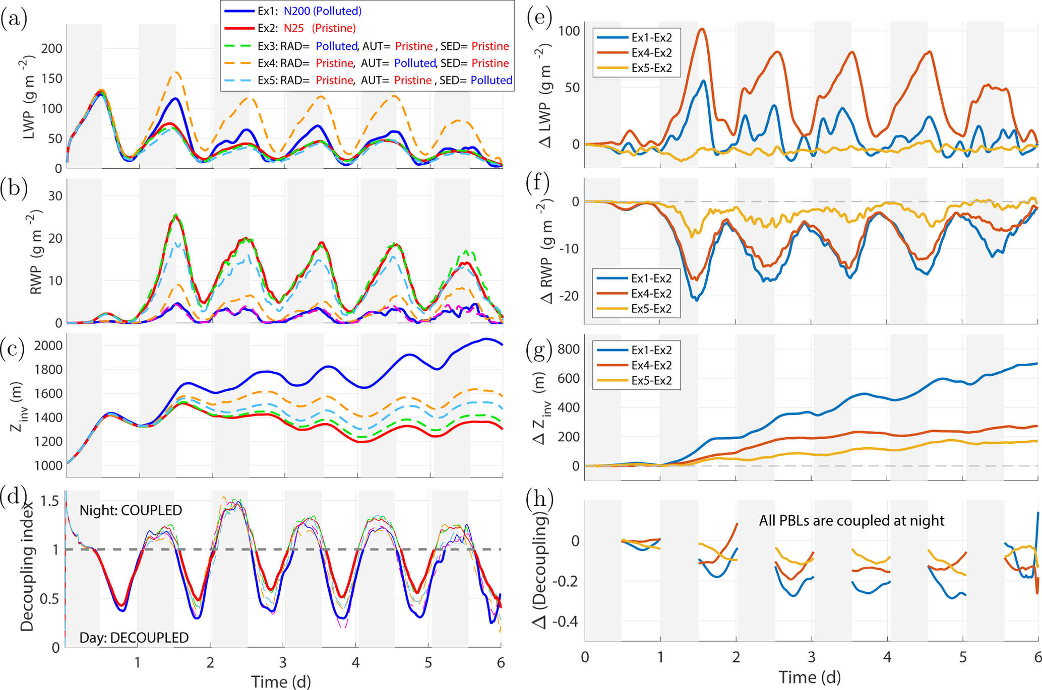 In our experimental design, modifying Nc influences three model processes directly: radiative transfer, autoconversion, and cloud water sedimentation. We perform a series of additional experiments where we impose the polluted Nc on a particular process rate while all other processes see the pristine Nc to demonstrate the importance of that process on the evolution of the boundary layer and cloud microphyscial properties. A description of these experiments is provided in Table 2. We show the evolution of four quantities to demonstrate the influence of the various processes. The first two are cloud microphysical quantities: LWP and rain water path (RWP). The second two are related to the structure of the boundary layer: inversion height zinv and decoupling index. Figure 5 shows the evolution of these four quantities for the various experiments. Several conclusions can be formed from these results: