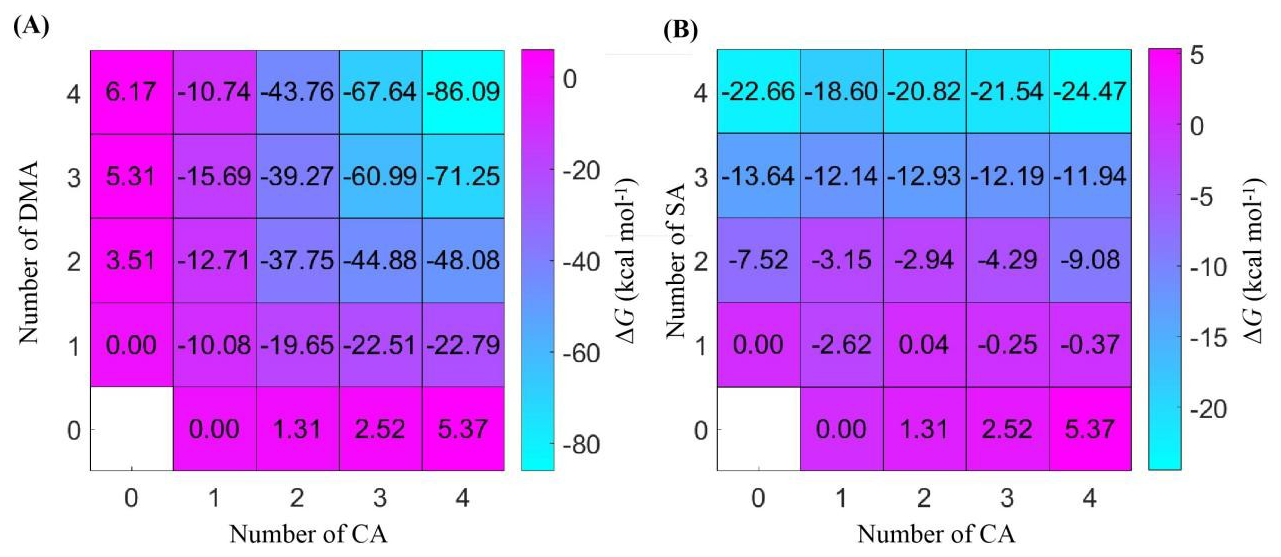The growth pathway of the CA-SA cluster system differs considerably from that of the CA-DMA cluster system. The cluster initially formed in the CA-SA cluster system is the (CA)2 cluster not the (CA)1(SA/DMA)1 cluster in the CA-DMA system. After the generation of (CA)2 cluster, the system can generate (CA)3(SA)1 clusters by successive addition of acid molecules. Subsequently, (CA)3(SA)1 clusters combine with (CA)1(SA)1 clusters to generate (CA)3(SA)2 clusters. The final (CA)4(SA)4 cluster of the system is generated by collision of a (CA)3(SA)2 cluster with an (SA)2 cluster.