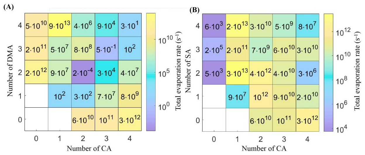 Cluster formation rates, steady-state concentrations, and growth paths for (CA)1–4(DMA)1–4 and (CA)1–4(SA)1–4 clusters were calculated using ACDC without considering the effects of charge and water (McGrath et al., 2012). ACDC simulation conclusions are obtained based on the birth and death equation (Almeida et al., 2013; Lu et al., 2020; Kürten et al., 2018). The (CA)5(DMA)5 clusters are set as boundary clusters (see Supporting Information (SI) for details). The concentration ranges of [CA], [SA] and [DMA] were set to 106–108, 106—108 cm−3 and 0.1–100 ppt, respectively. Widely dispersed DMA has an atmospheric concentration of 0.4–10 ppt over the ocean and plays a key role in marine NPF (van Pinxteren et al., 2019). DMA at concentrations up to 100 ppt is primarily used for prediction.