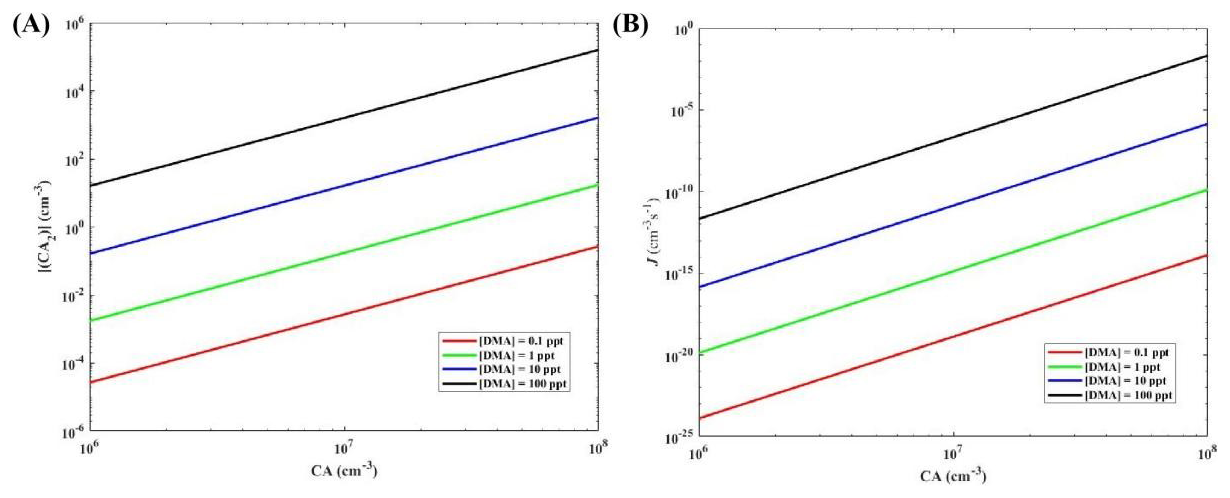 Figure 4Simulated steady-state CA dimer concentration ∑[(CA)2] (cm−3) (A) and the cluster formation rates J (cm−3 s−1) out of the simulation systems (B) as a function of [CA] at 278 K.
