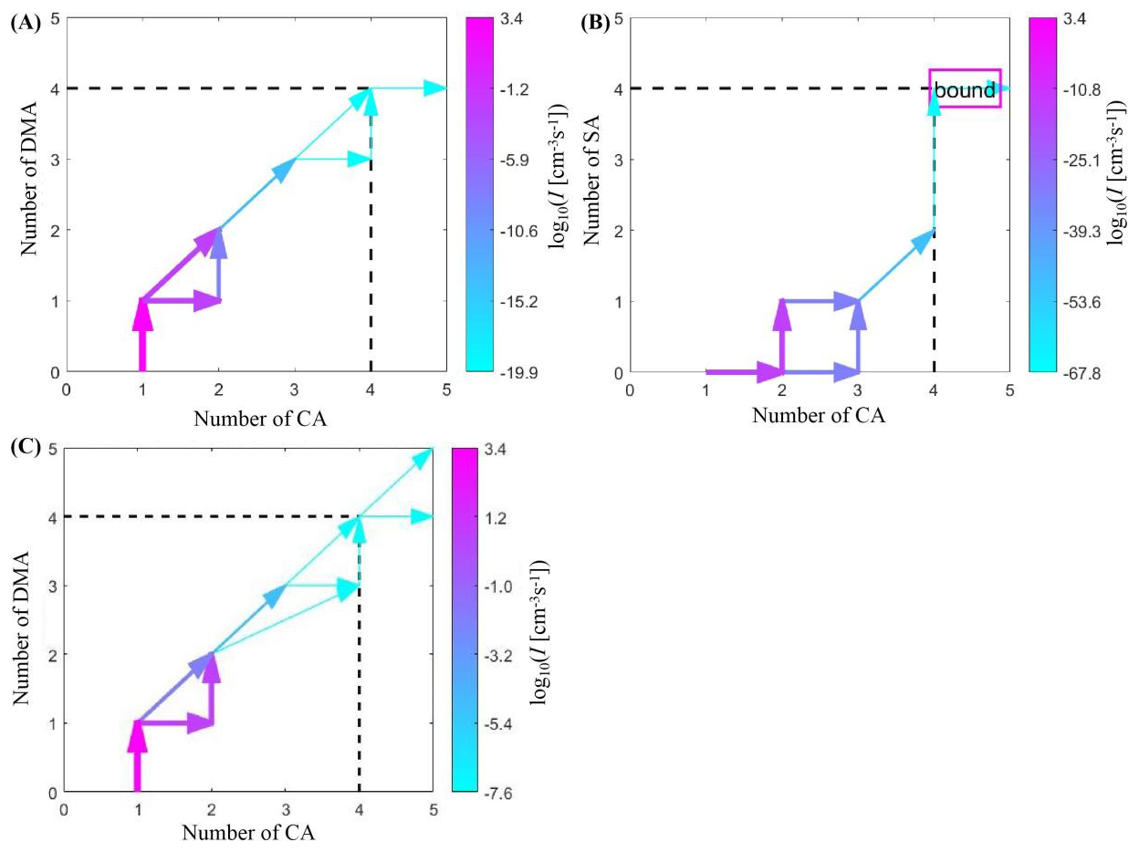 Figure 6(A) Main clustering pathways of (CA)1–4(DMA)1–4 clusters at 278 K, [CA] = 106 cm−3, and [DMA] = 5 ppt. (B) Main clustering pathways of (CA)1–4(SA)1–4 clusters at 278 K, [CA] = 106 cm−3, and [SA] = 106 cm−3. (C) Main clustering pathways of (CA)1–4(DMA)1–4 clusters at 238 K, [CA] = 106 cm−3, and [DMA] = 5 ppt.