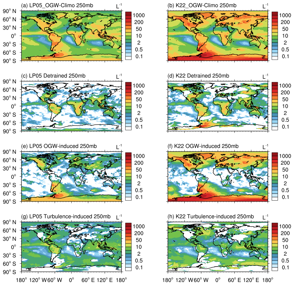 Figure 4 shows the global longitude-latitude distribution of annual mean Ni at 250 hPa. In both schemes, cirrus clouds related to convective detrainment are frequently simulated over land in low and mid-latitudes, while cirrus clouds due to OGWs primarily occur over mountains and highlands in mid- and high latitudes. Turbulence-induced cirrus clouds exhibit widespread global coverages. Consistent with the results shown in Fig. 2, the K22_OGW-Climo experiment produces higher Ni values in all three cirrus types compared to the LP05_OGW-Climo experiment (Fig. 4a and b). While the distribution of detrained Ni appears similar in low latitudes between the two schemes, notable differences emerge in high latitudes, with the K22 scheme generating more ice crystals, particularly over Alaska and the Antarctic Peninsula (Fig. 4c and d). OGW-induced ice crystals in the K22 scheme are more abundant and broadly distributed over mountainous regions compared to the LP05 scheme (Fig. 4e and f). Additionally, the K22 scheme simulates a higher number of turbulence-induced ice crystals, especially over mid- and high latitude regions (Fig. 4g and h). For OGW-induced cirrus clouds, the K22 scheme distributes high Ni values (>100 L−1) more extensively than the LP05 scheme, particularly in mid- and high latitudes. This broader distribution results in a higher cloud frequency in the K22 scheme, as shown in Fig. S3.
