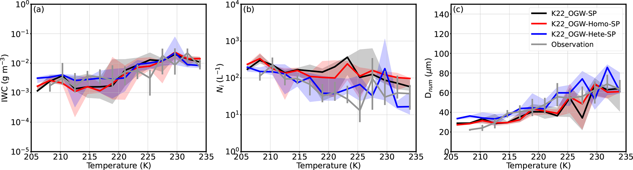 Figure 6Comparison of IWC (a), Ni (b) and Dnum (c) with respect to temperature between observations and K22 sensitivity experiments (K22_OGW, K22_OGW-Homo-SP and K22_OGW-Hete-SP) for orographic cirrus (5 d) during the SPARTICUS campaign.