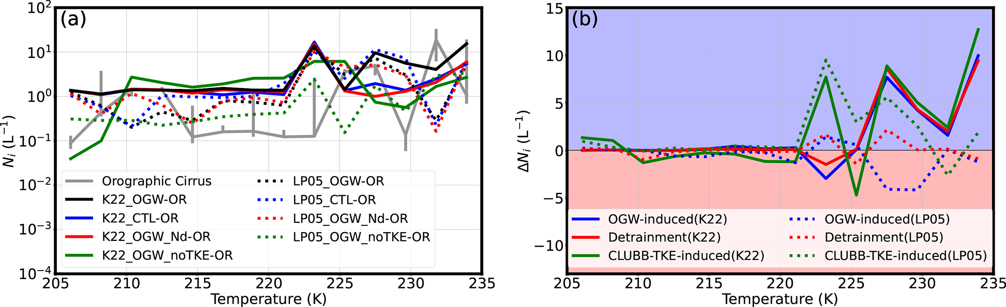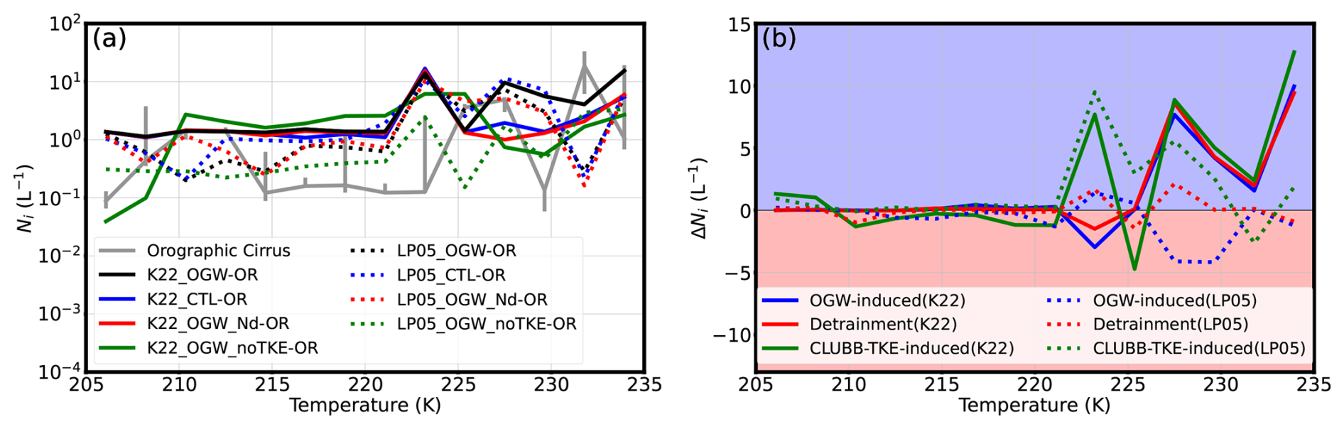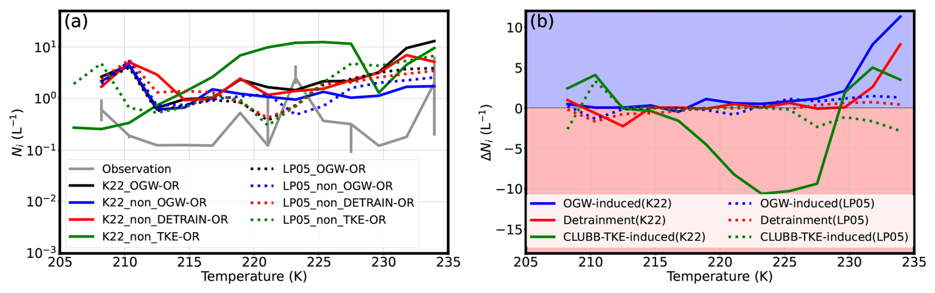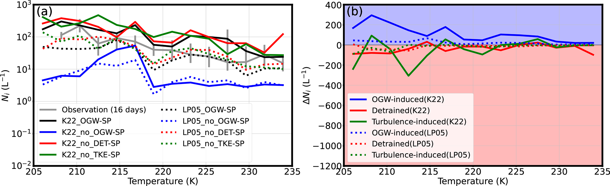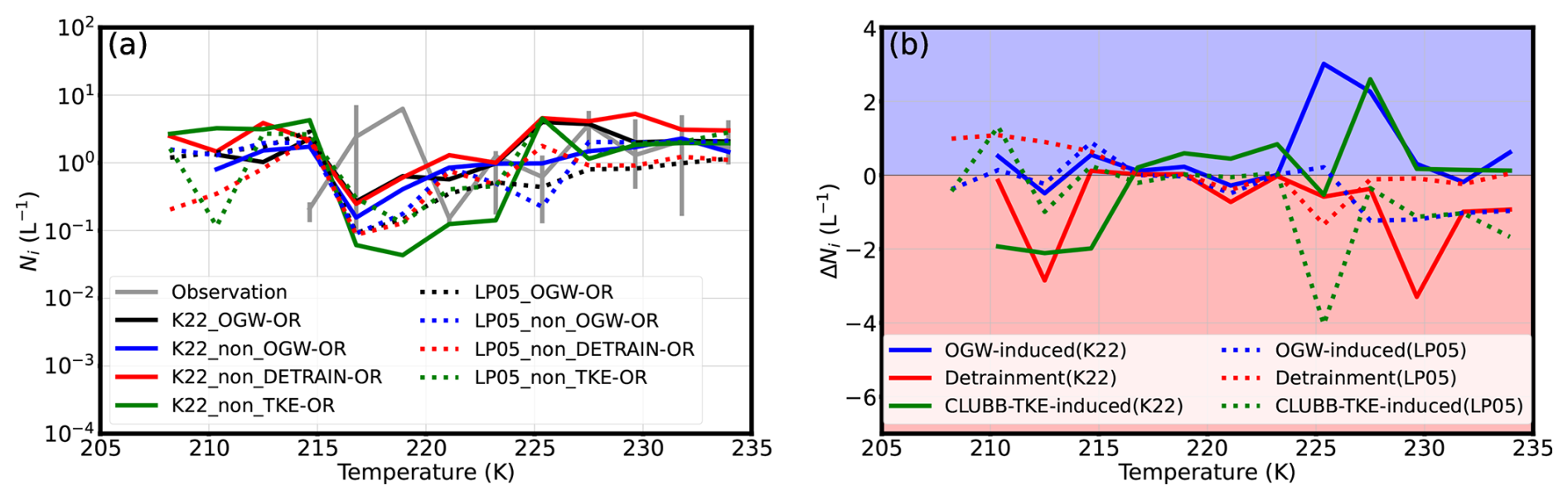 Figure 5(a) Comparison of Ni between observations and experiments and (b) differences in median Ni values (ΔNi) between sensitivity tests (no_OGW, no_DET and no_TKE) and reference experiments (OGW) in LP05 and K22 schemes during the SPARTICUS campaign. In panel (a), solid lines represent median Ni values from K22 experiments, while dotted lines represent those from LP05 experiments. The bars indicate observed Ni values, ranging from the 25th percentile to the 75th percentile. In panel (b), the number of ice crystals due to OGW is calculated as Ni in OGW experiments minus Ni in no_OGW experiments. The number of ice crystals from convection detrainment is calculated as Ni in OGW experiments minus Ni in no_DET experiments. The number of ice crystals due to turbulence is calculated as Ni in OGW experiments minus Ni in no_TKE experiments. The blue shaded region indicates that the ice crystal source contributes to Ni and increases Ni in the reference experiments. The red shaded region indicates that the ice crystal source competes with other sources and inhibits Ni in the reference experiments.