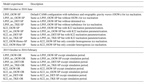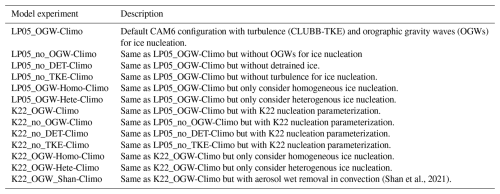 The climatology experiments and nudged simulations related to the Small Particles in Cirrus (SPARTICUS) and O2 N2 Ratio and CO2 Airborne Southern Ocean Study (ORCAS) campaigns are designed and listed in Tables 1 and 2, respectively. All simulations are conducted at a resolution of 0.9°×1.25° with 56 vertical layers. We focus on the SPARTICUS and ORCAS campaigns in this study because they provide critical data on OGW-induced ice crystals. The SPARTICUS campaign involves flights over the mountainous regions from winter to summer, while the ORCAS campaign focuses on both ocean and continental regions during the summer. For the nudged simulations for the two field campaigns (Table 2), the modelled horizontal winds are nudged towards the MERRA2 reanalysis data.