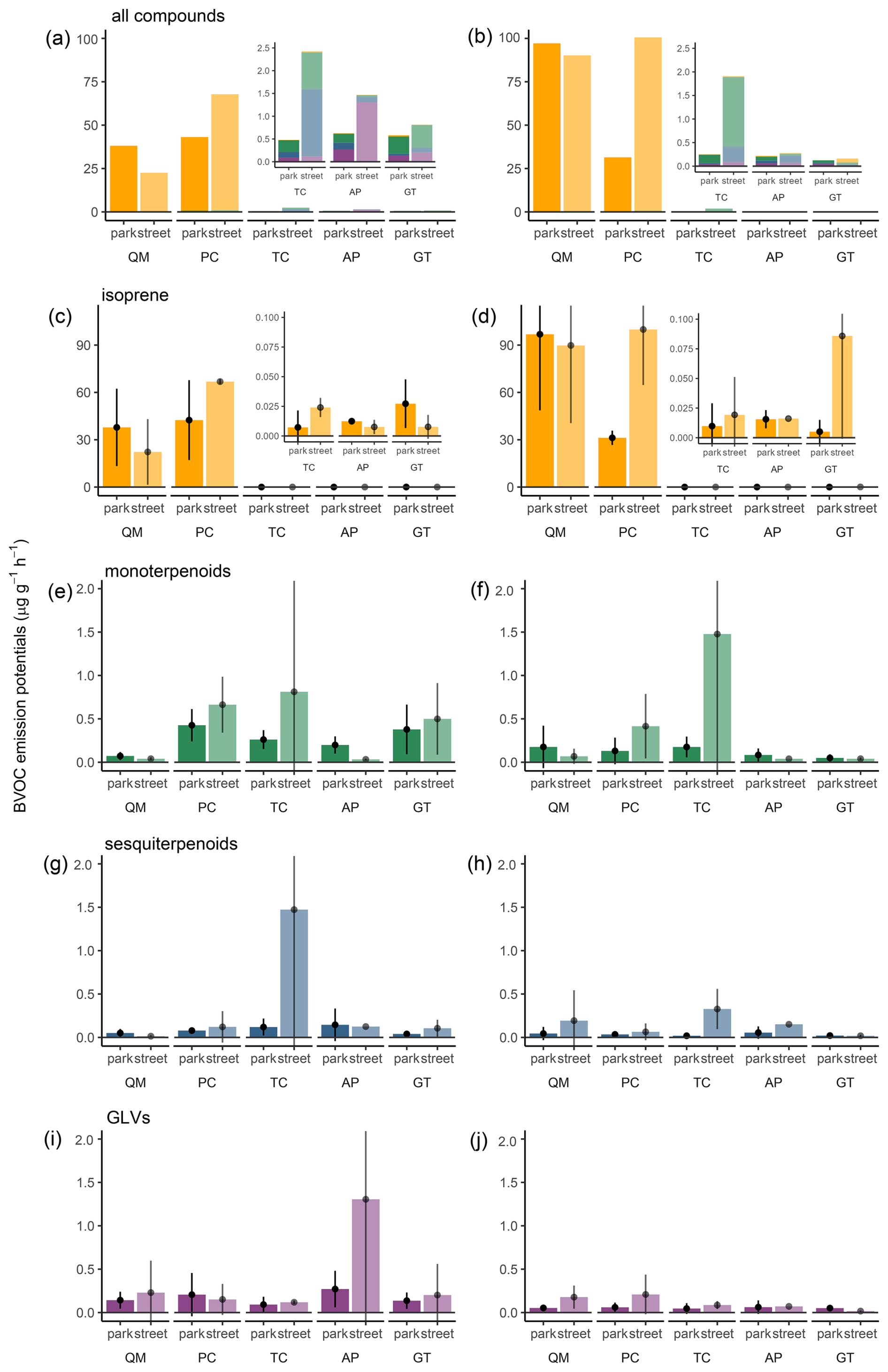 Figure 1BVOC emission potentials across all compound groups (a–b) and separately for isoprene (c–d), monoterpenoids (e–f), sesquiterpenoids (g–h) and green leaf volatiles (GLVs, i–j), for study species (QM, Quercus macrocarpa; PC, Populus x canescens; TC, Tilia cordata; AP, Acer platanoides; GT, Gleditsia triacanthos) in parks and streets in Montreal, measured in June (period I: a, c, e, g, and i) and August (period II: b, d, f, h, and j) 2022. The error bars show the 95 % confidence intervals for the mean emission potentials. For each bar, nobs=2–3.