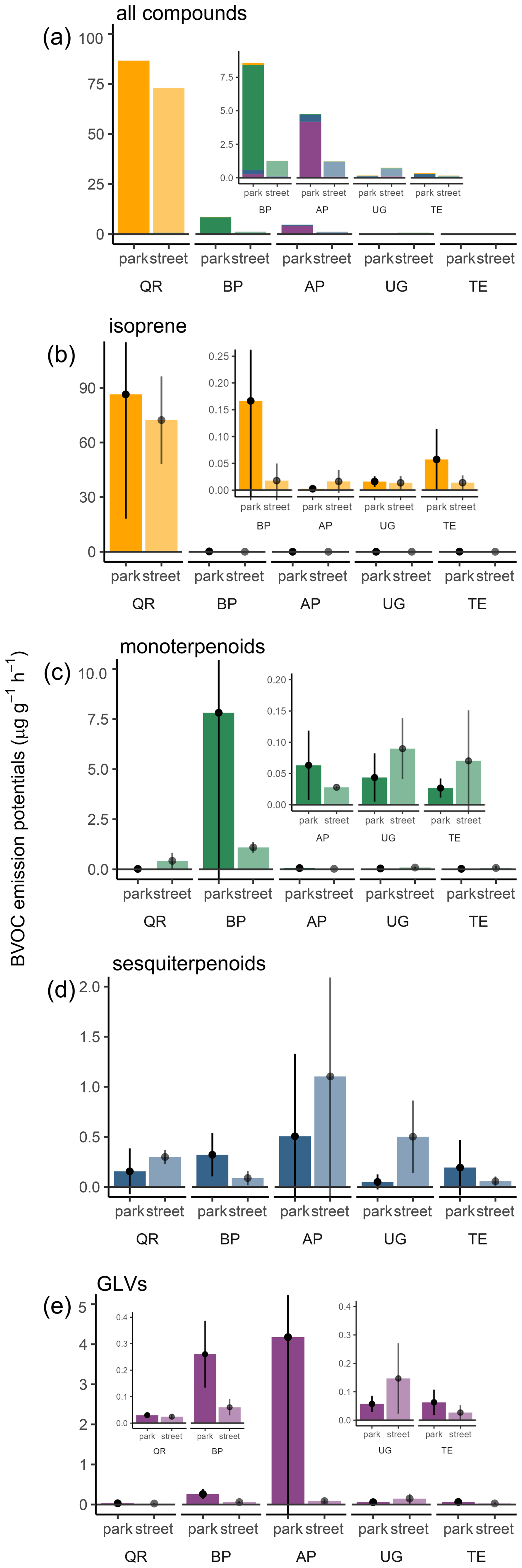 Figure 2BVOC emission potentials across all compound groups (a) and separately for isoprene (b), monoterpenoids (c), sesquiterpenoids (d), and green leaf volatiles (GLVs, e) for the study species (QR, Quercus robur; BP, Betula pendula; AP, Acer platanoides; UG,Ulmus glabra; TE, Tilia x europaea) in parks and streets in Helsinki, in July 2022. The error bars show the 95 % confidence intervals for the mean emission potentials. For each bar, nobs=3.