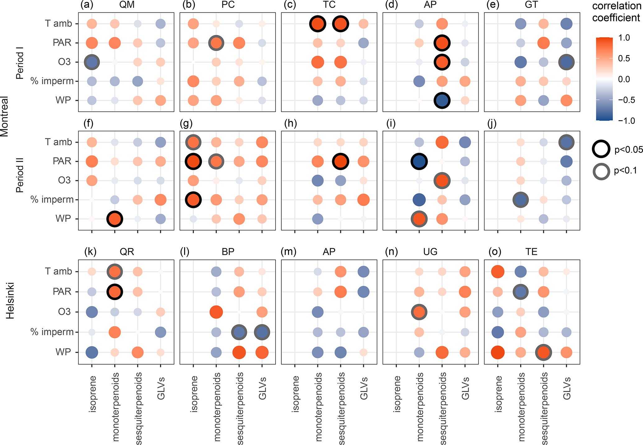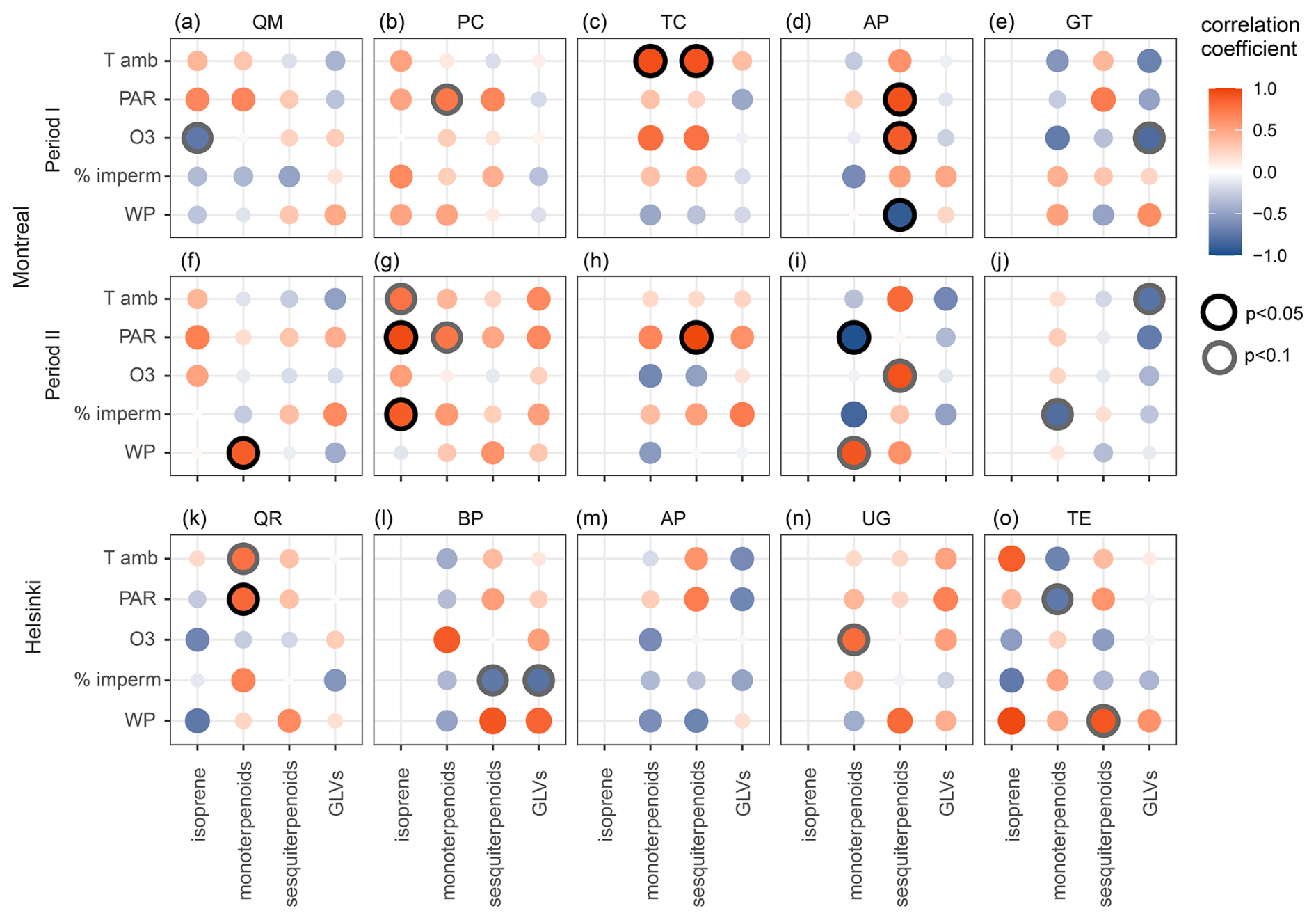 Figure 3Pearson's correlation coefficients between the emissions potentials of compound groups and environmental (Tamb, ambient temperature during sampling; PAR, photosynthetically active radiation during sampling; O3, ambient ozone concentration during sampling; % imperm, percentage of surface impermeability within a 10 m radius around the tree (Helsinki) or mean surface impermeability of the city block (Montreal)) and physiological (WP, shoot water potential) factors as representatives of sources or indicators of stress. Correlations were calculated separately by species, city and measurement period. Species: AP, Acer platanoides; GT, Gleditsia triacanthos; PC, Populus x canescens; QM, Quercus macrocarpa; TC, Tilia cordata; BP, Betula pendula; QR, Quercus robur; TE, Tilia x europaea; UG, Ulmus glabra.