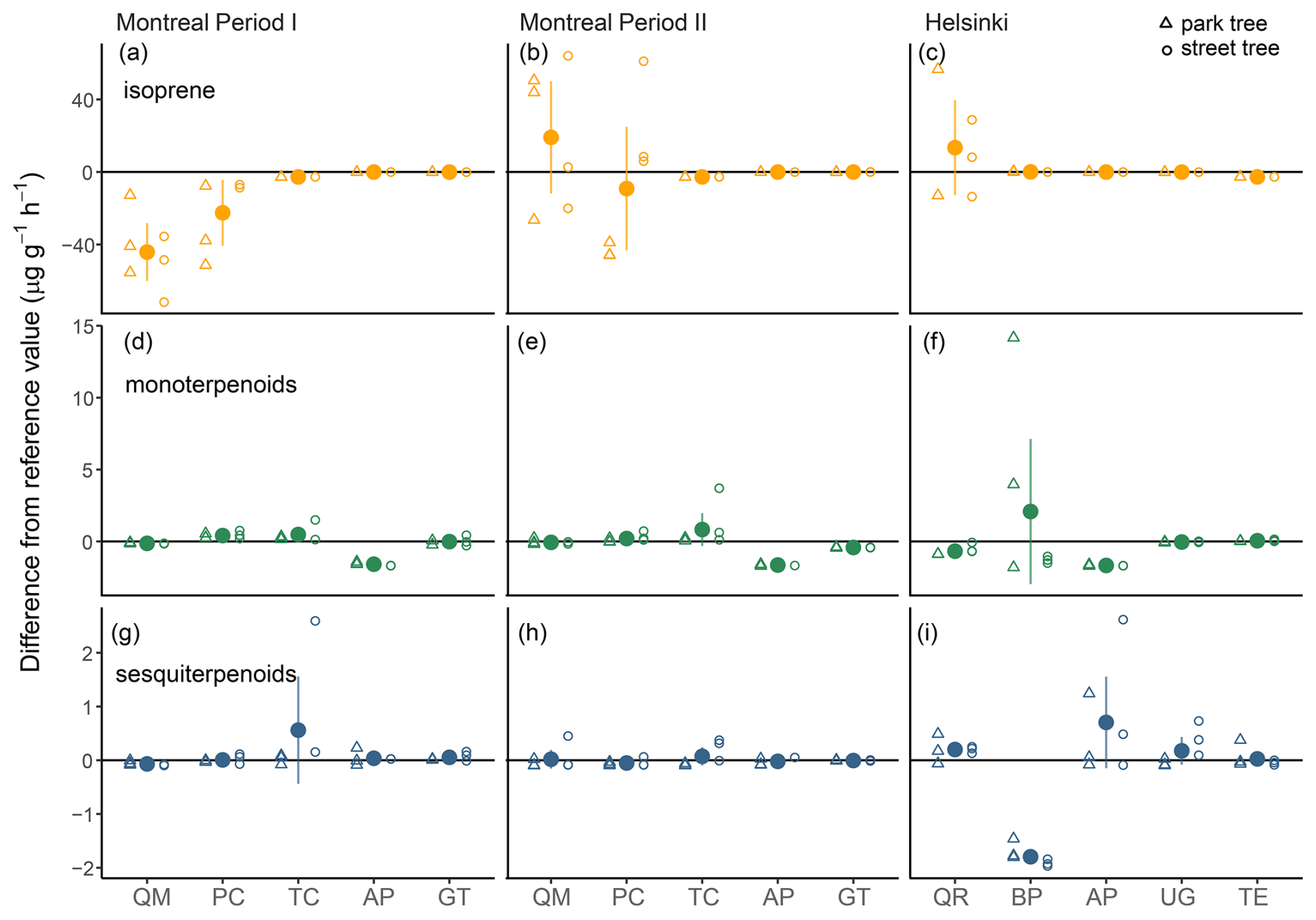 Figure 4The difference between the isoprene (a–c), monoterpenoid (d–f), and sesquiterpenoid (g–i) emission potentials measured from urban trees and the reference values (mean value of the emission potentials collected from the emissions databases), separately for species in Montreal in June (period I: a, d and g) and August (period II: b, e, and h) and in Helsinki in July (c, f, and i). The filled dots indicate the mean difference across the trees (nobs=4–6) and the error bars show the 95 % confidence intervals (some are smaller than the dot diameter). The open triangles show the difference for each park tree and the open dots for each street tree. Species: AP, Acer platanoides; GT, Gleditsia triacanthos; PC, Populus x canescens; QM, Quercus macrocarpa; TC, Tilia cordata; BP, Betula pendula; QR, Quercus robur; TE, Tilia x europaea; UG, Ulmus glabra.