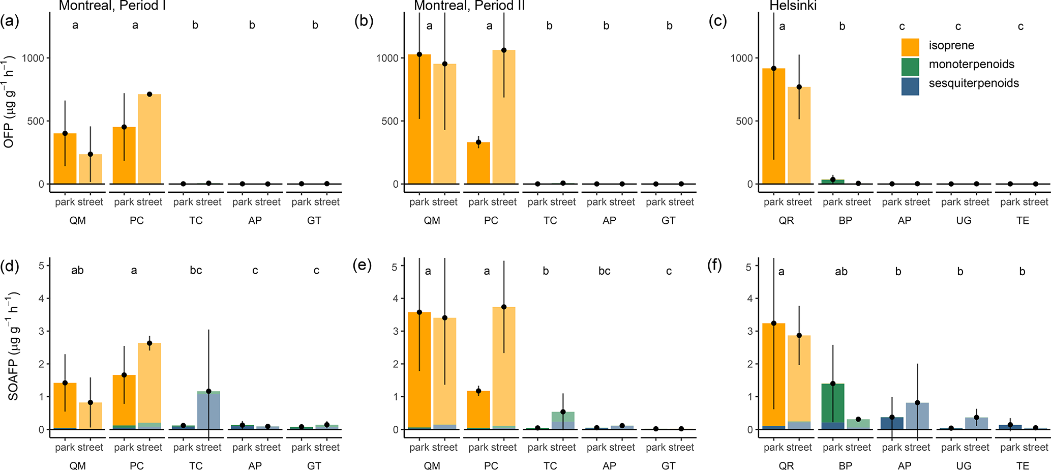 Figure 5O3 formation potential (OFP, a–c) and SOA formation potential (SOAFP, d–e) of the isoprene, monoterpenoid, and sesquiterpenoid emissions by urban tree species in Montreal in June (period I: a and d) and August (period II: b and e) and in Helsinki in July (c, f). The dots with error bars indicate the mean and the 95 % confidence intervals for the OFP or SOAFP per species (nobs=1–3) and the colours indicate the contributions of each compound group. The different lowercase letters indicate a significant difference between species within the city and measurement period in Montreal. Species: AP, Acer platanoides; GT, Gleditsia triacanthos; PC, Populus x canescens; QM, Quercus macrocarpa; TC, Tilia cordata; BP, Betula pendula; QR, Quercus robur; TE, Tilia x europaea; UG, Ulmus glabra.