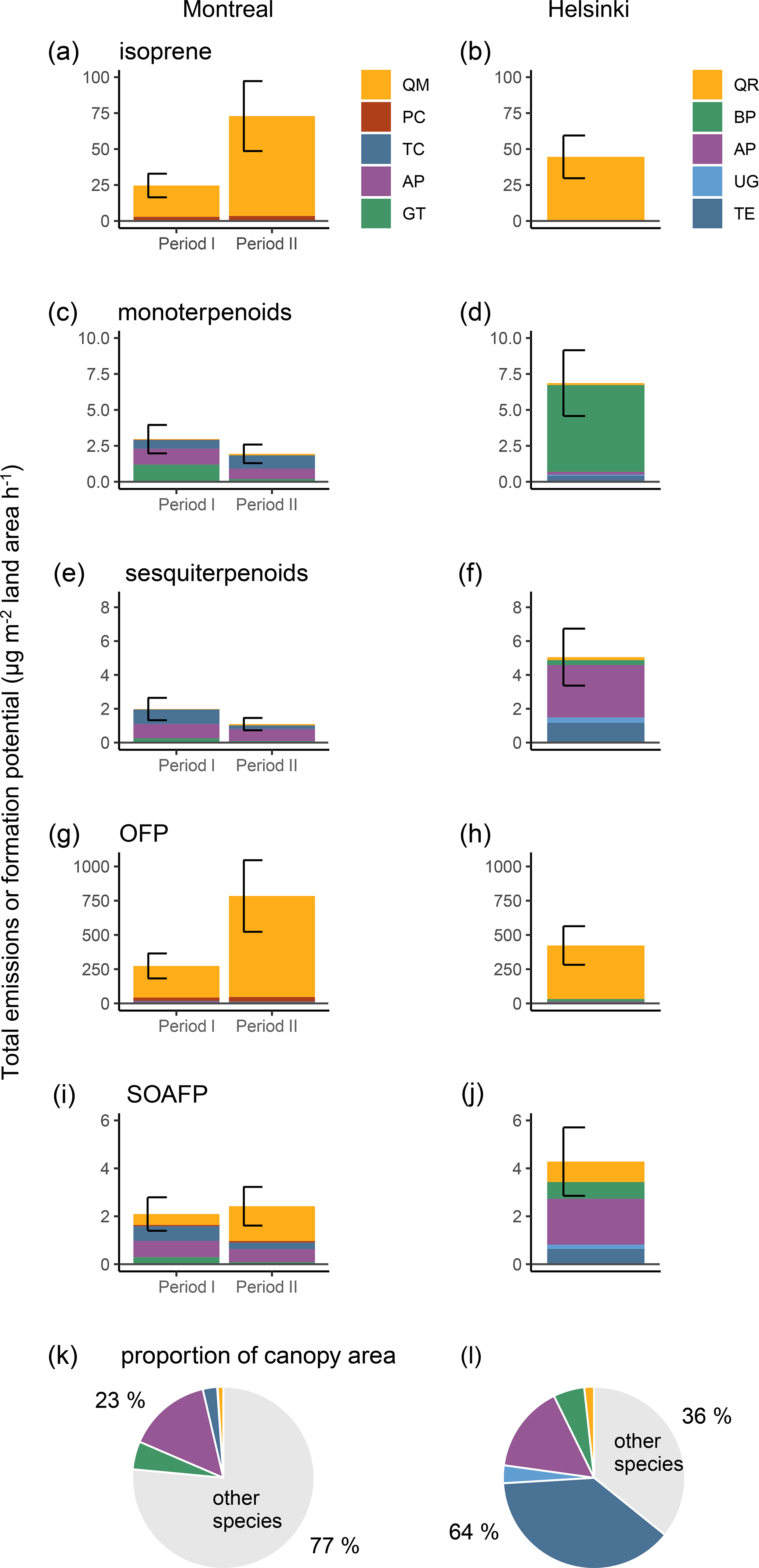 Figure 6Upscaled total emission potential per land area for isoprene (a–b), monoterpenoids (c–d), and sesquiterpenoids (e–f), as well as for their O3 formation potential (OFP, g–h) and SOA-formation potential (SOAFP, i–j) of the study species within the upscaling test area in Montreal in June and August (periods I and II: a, c, e, g and i) and Helsinki in July 2022 (b, d, f, h and j). The BVOC emission, OFP, and SOAFP intensity estimates only include the individuals from our study species, whereby their proportions of the entire canopy area within the upscaling test areas are listed for Montreal (k) and Helsinki (l). The vertical brackets show the estimated total emissions or formation potentials without correction for shading (upper limit) and a stronger correction for shading (lower limit).
