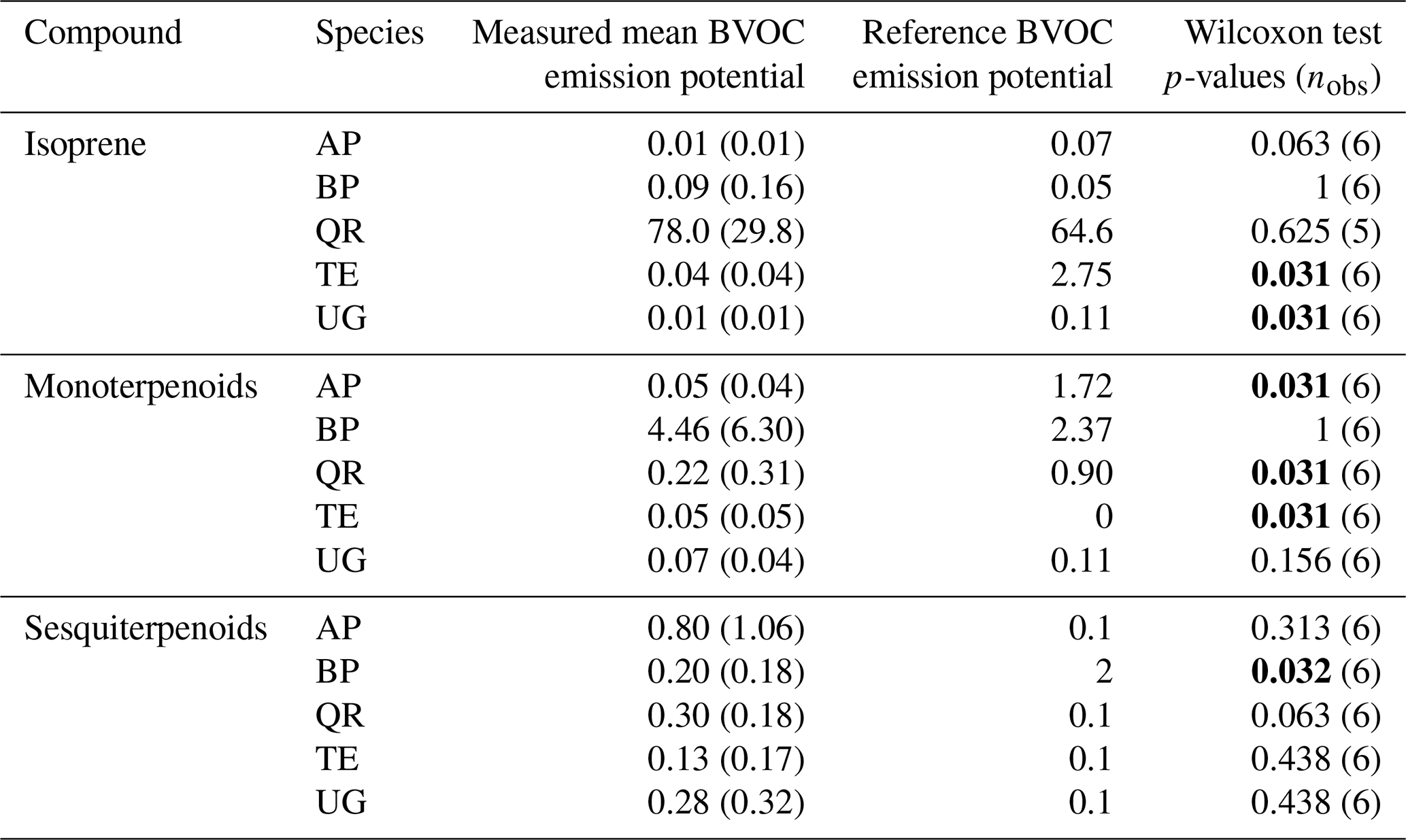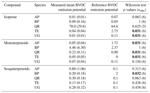 Table 4The emission potentials of isoprene and monoterpenoid and sesquiterpenoid sums as the mean (standard deviation) across the trees measured per species in Helsinki in July 2022, as µg g(DW)−1 h−1, at T 30 °C and PAR 1000 µmol m−2 s−1. In the Wilcoxon test, the measured values were compared against the reference value (mean value across the values listed in Table S4); significant deviations (p<0.05) are highlighted in bold. AP, Acer platanoides; BP, Betula pendula; QR, Quercus robur; TE, Tilia x europaea; UG, Ulmus glabra. nobs, number of observations (trees) in the Wilcoxon test.