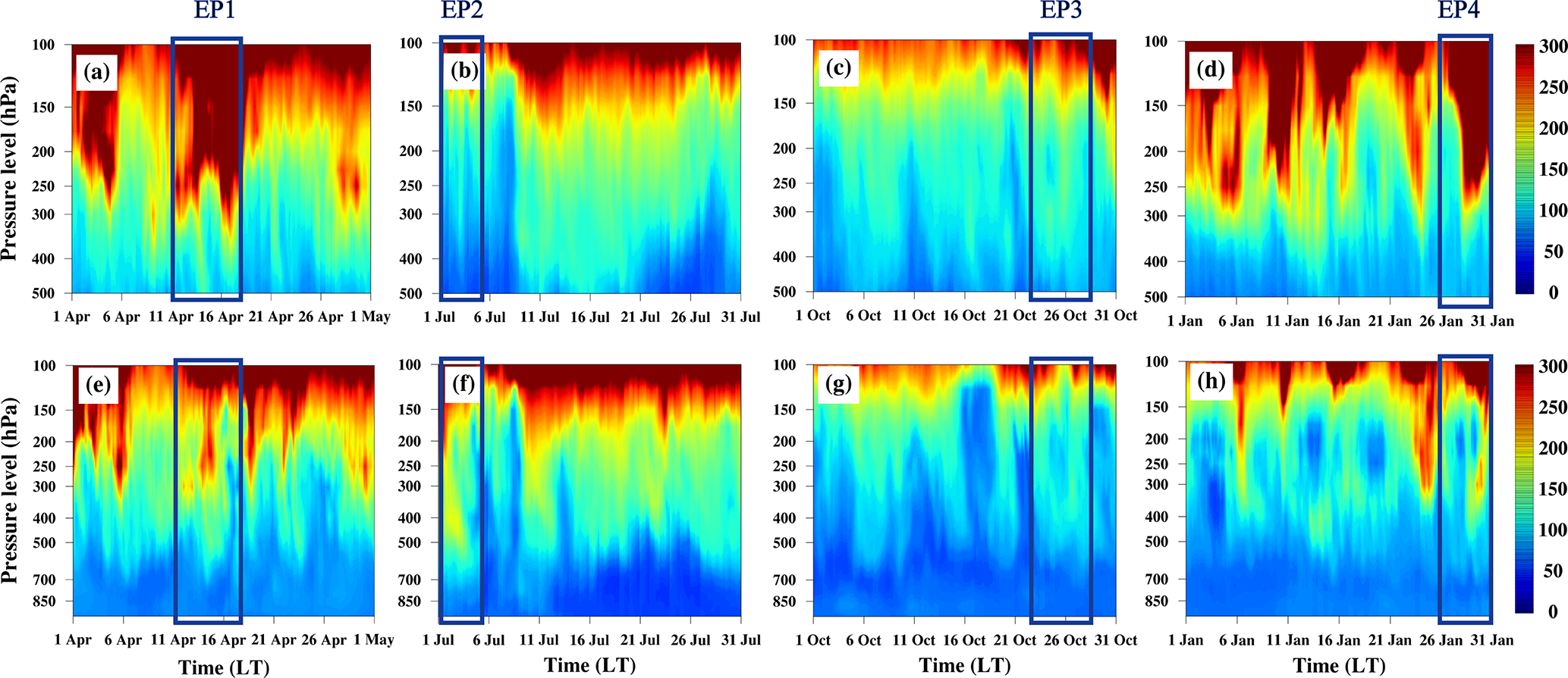 Figure 1Vertical-time cross sections of O3 mixing ratio (ppb) over the TP (a–d) and SCB (e–h) during April (a, e), July (b, f), October (c, g) and January (d, h) in 2017. The dark-blue boxes respectively represent the selected four SI episodes (EP1–EP4).