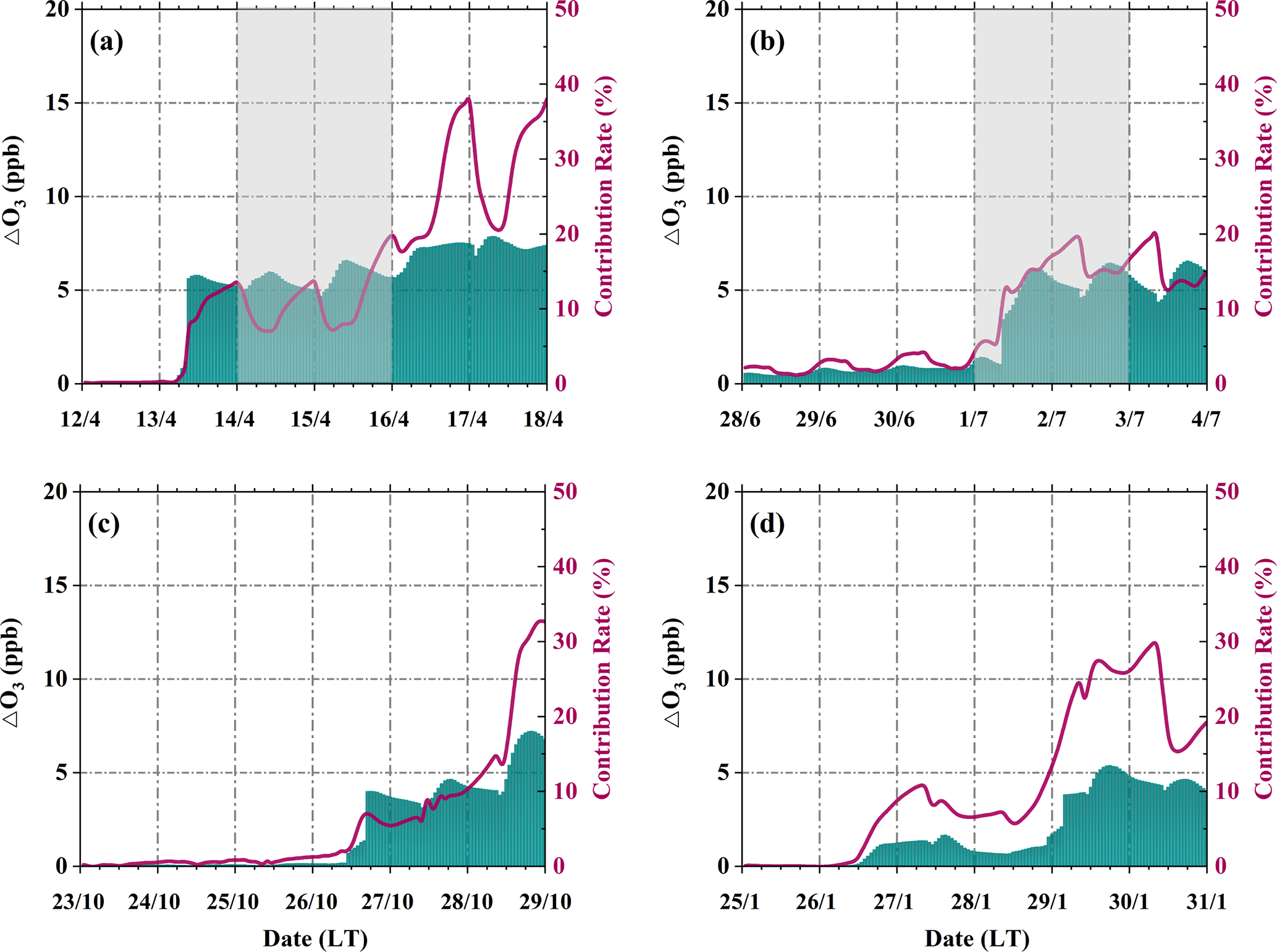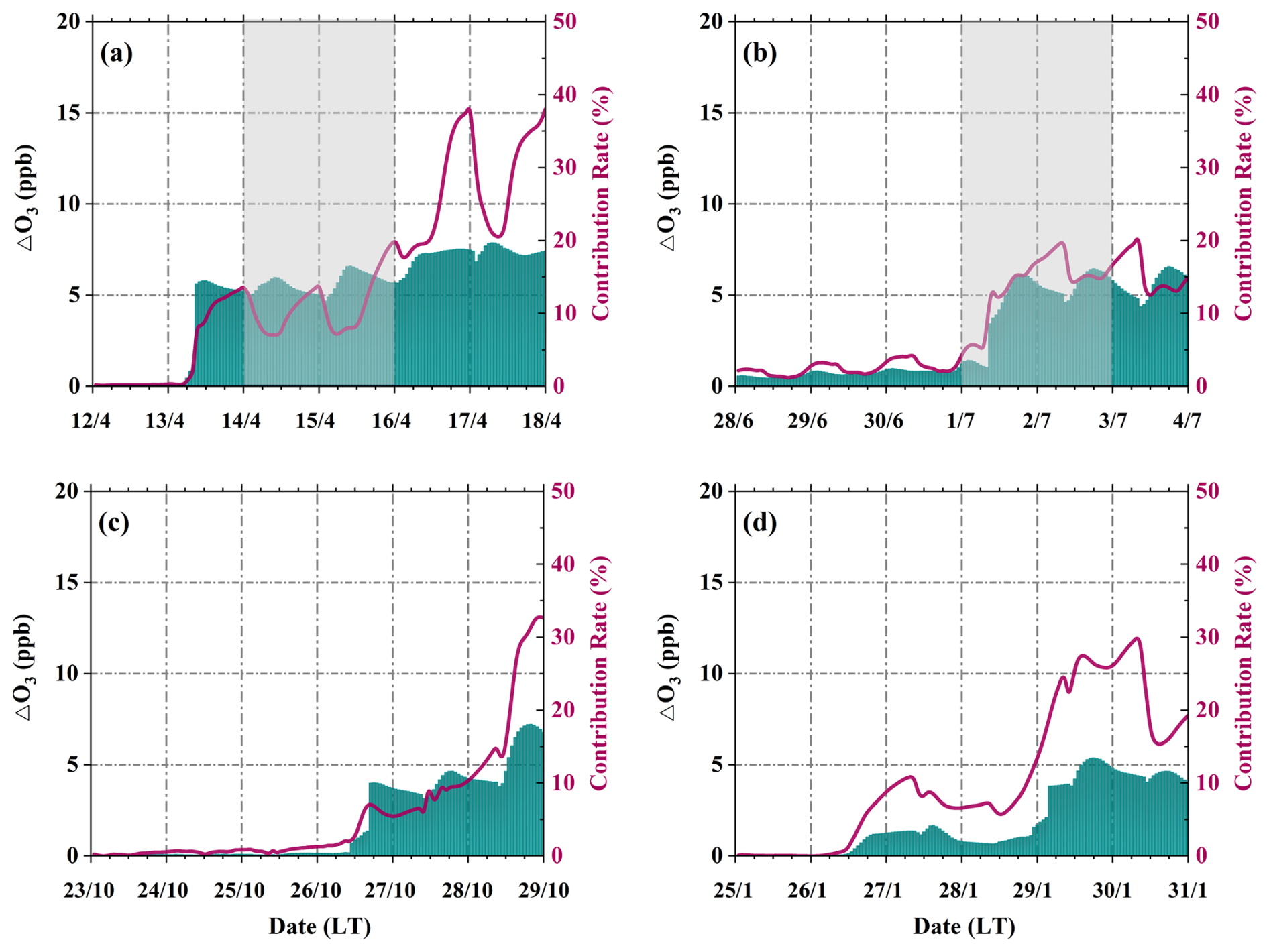 Figure 5Hourly variations of near-surface O3 (ppb, blue-filled areas) during the period of SI events (a) EP1, (b) EP2, (c) EP3 and (d) EP4 with their relative contribution proportions (RC) to the ambient atmosphere (dark red curve) averaged over the SCB. The gray shade indicates the regional O3 pollution period.