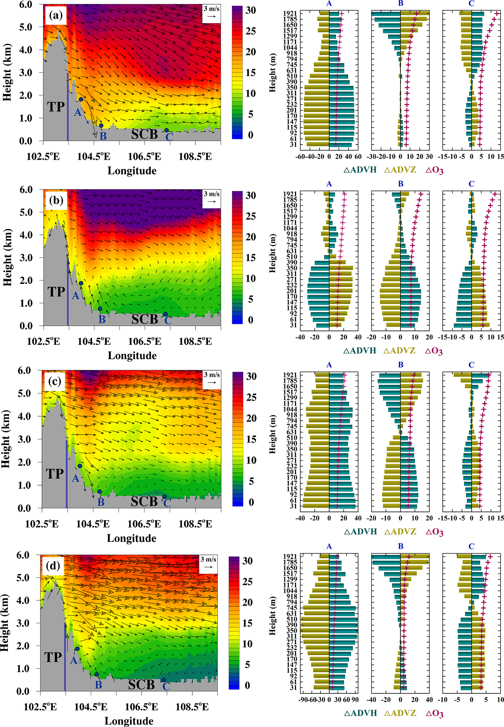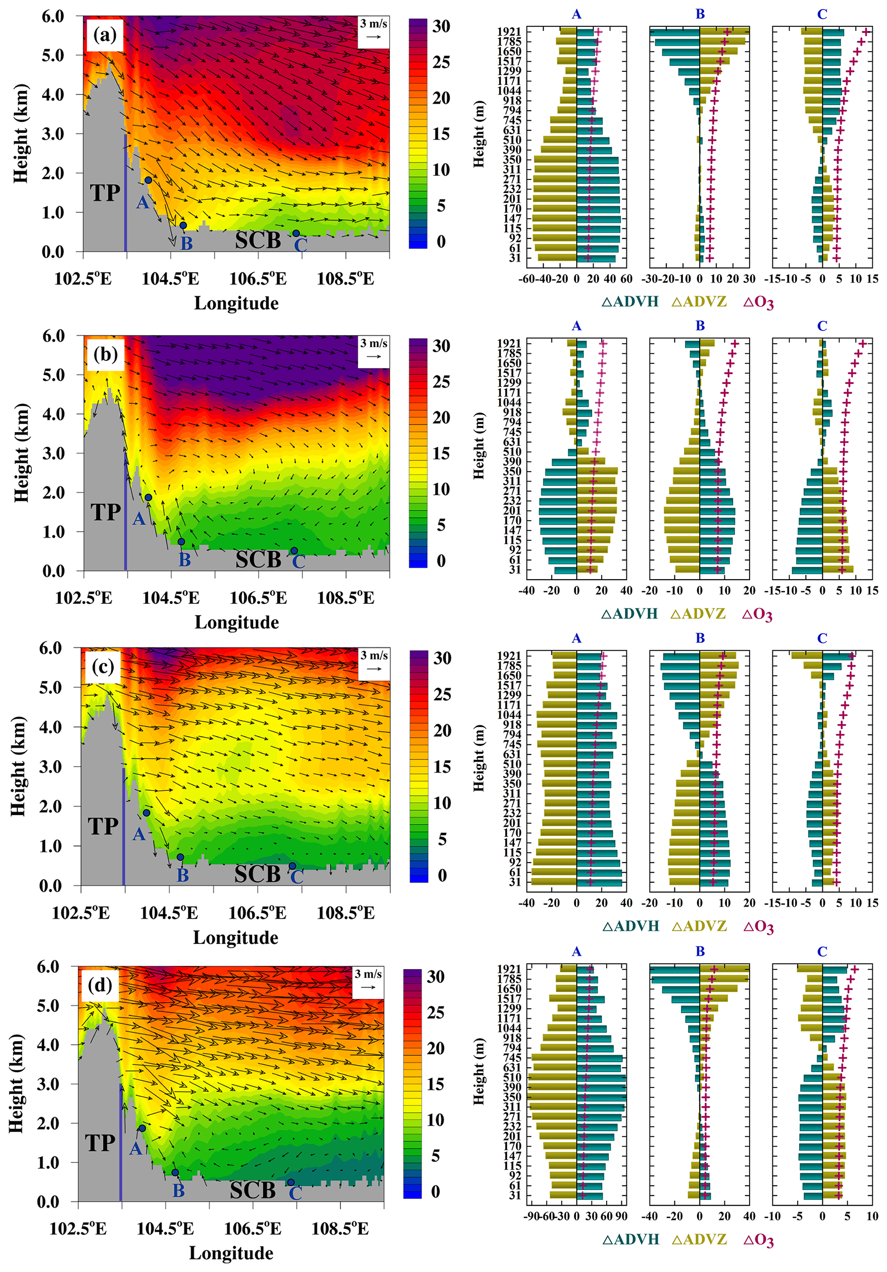 Figure 8Height-longitude cross-sections of O3 (ppb, color contours) and wind vectors averaged between 28 and 33° N on (a) 16 April, (b) 1 July, (c) 26 October and (d) 29 January 2017 (left panel) with correspondingly IPR on horizontal transport (ADVH) and vertical transport (ADVZ) respectively at points A (plateau region), B (western edge of SCB) and C (central SCB). The blue lines roughly outline TP's boundary.