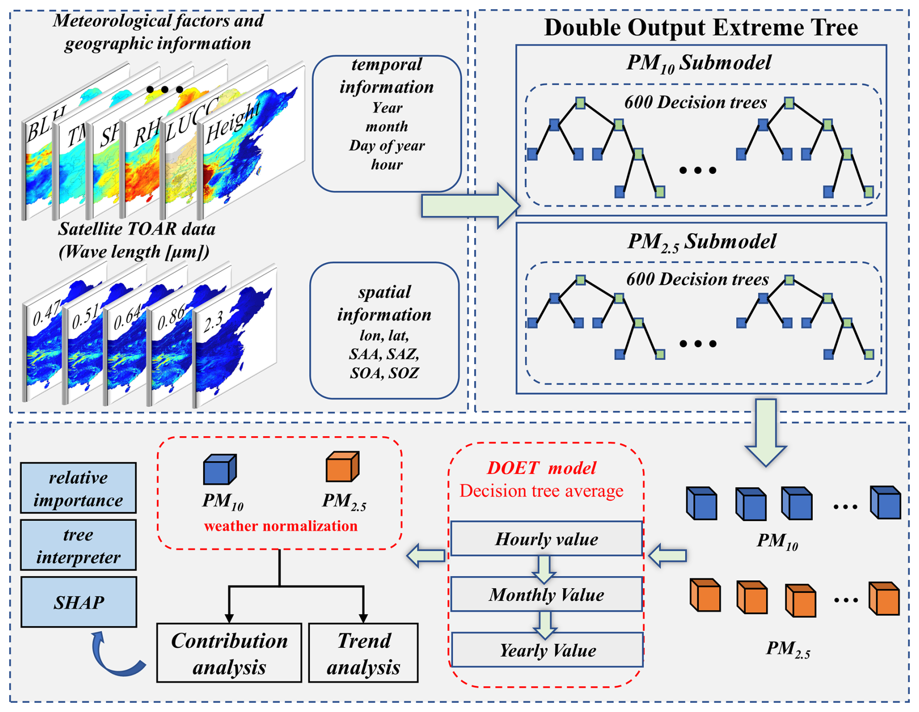 Here, f represents the DOET model, and TOAR1,2,3,4,6 denotes the radiance values of the three visible channels (0.46, 0.51, and 0.64 µm) and the two near-infrared channels (0.86 and 2.3 µm). BLH, RH, SP, T2M, WD, WS and NSR are meteorological variables, while Height, LUCC and RK represent geographical information. The variables lon (Longitude), lat (Latitude), SAA, SAZ, SOA and SOZ representing spatial information. The variables year, mon (month), doy (day of the year), and hour are temporal information reflecting the influence of anthropogenic emissions on PM pollution (Wei et al., 2020). Time variables (year, month) effectively characterize cyclical patterns and long-term trends in human activity, serving as reliable proxy indicators in pollution analysis (Song et al., 2023). Monthly cycles directly reflect seasonal rhythms: winter heating spikes PM2.5 and SO2 levels (Liu et al., 2017), agricultural phases amplify ammonia emissions (Ma et al., 2025), and transportation peaks during holidays elevate NO2 concentrations (Hua et al., 2021). Annual trends capture industrial evolution and policy impacts, such as the PM2.5 reduction after implementing the “Air Pollution Prevention Action Plan” (Geng et al., 2024; Geng et al., 2021). As standardized, quantifiable metrics, time variables circumvent data limitations for complex activities (e.g., energy consumption, economic behaviors, urban sprawl), enable cross-regional comparisons without normalization, and reveal pollution responses to socioeconomic rhythms and policy efficacy (Dai et al., 2021; Shi et al., 2021). Specifically, year and month (mon) are used to represent the interannual and intra-annual variations in anthropogenic emissions, respectively (Zhang et al., 2019a; Park et al., 2019). The estimation workflow is illustrated in Fig. 1. The specific estimation process of the DOET model is as follows: firstly, meteorological factors, geographic information, and satellite TOAR data are input into the DOET model and matched with PM observation data. Then, the DOET model fits the PM observation data with the input variables to obtain two ET estimation models (PM10 and PM2.5). Finally, the two ET models are integrated to obtain the DOET model, and the estimation results of PM10 and PM2.5 are output simultaneously to save computation time. Finally, the obtained PM10 and PM2.5 data are subjected to further analysis. Additionally, we performed weather normalization on the PM data to mitigate the impact of meteorological events (Grange and Carslaw, 2019).