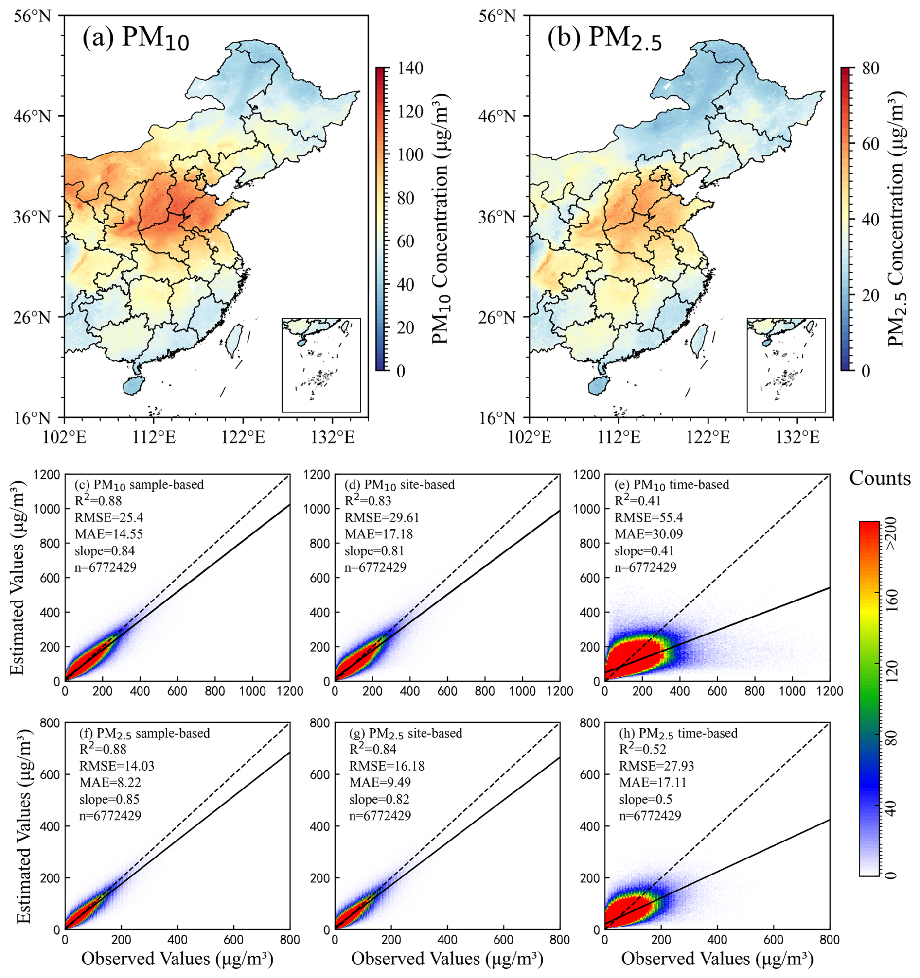 The hourly ground station observations of near-surface PM10 and PM2.5 concentrations are obtained from the China National Environmental Monitoring Center (CNEMC), which can be accessed on its official website (http://www.cnemc.cn/en/, CNEMC, 2025). Himawari-8 TOAR data provided by the Japan Meteorological Agency (http://www.eorc.jaxa.jp/ptree/index.html, last access: 20 September 2025). Meteorological variables were derived from the reanalysis data set provided by the European Centre for Medium-Range Weather Forecasts (ECMWF) (https://cds.climate.copernicus.eu/cdsapp#!/dataset/, ECMWF, 2025). MODIS Land use/cover change (LUCC) product can be downloaded from https://doi.org/10.5067/MODIS/MCD12C1.061 (Friedl and Sulla-Menashe, 2022). The 2015 UN-adjusted population density data (RK) can be downloaded from http://sedac.ciesin.columbia.edu/data/collection/gpw-v4/documentation (Center For International Earth Science Information Network-CIESIN-Columbia University, 2018). SRTM-3 elevation data jointly measured by NASA and the U.S. Department of Defense's National Imagery and Mapping Agency (NIMA) (HEIGHT) can be downloaded from https://doi.org/10.5067/MEaSUREs/SRTM/SRTMGL3.003 (NASA JPL, 2013). The particulate matter data generated in the manuscript can be obtained at the following URL: https://doi.org/10.5281/zenodo.17090707 (Song, 2025).