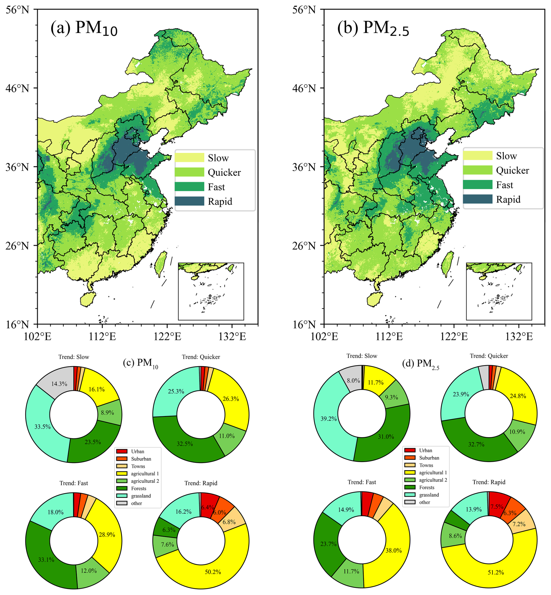 The trends in PM10 and PM2.5 concentrations were categorized into four levels based on percentiles: slow decline (grid points with a decline trend below the 25th percentile), moderate decline (grid points with a decline trend between the 25th and 75th percentiles), rapid decline (grid points with a decline trend between the 75th and 95th percentiles), and sharp decline (grid points with a decline trend above the 95th percentile). As shown in Fig. 4, the regions with the most significant changes in urban and rural PM trends are mainly concentrated in the Beijing-Tianjin-Hebei region, the Guanzhong region and Central China.