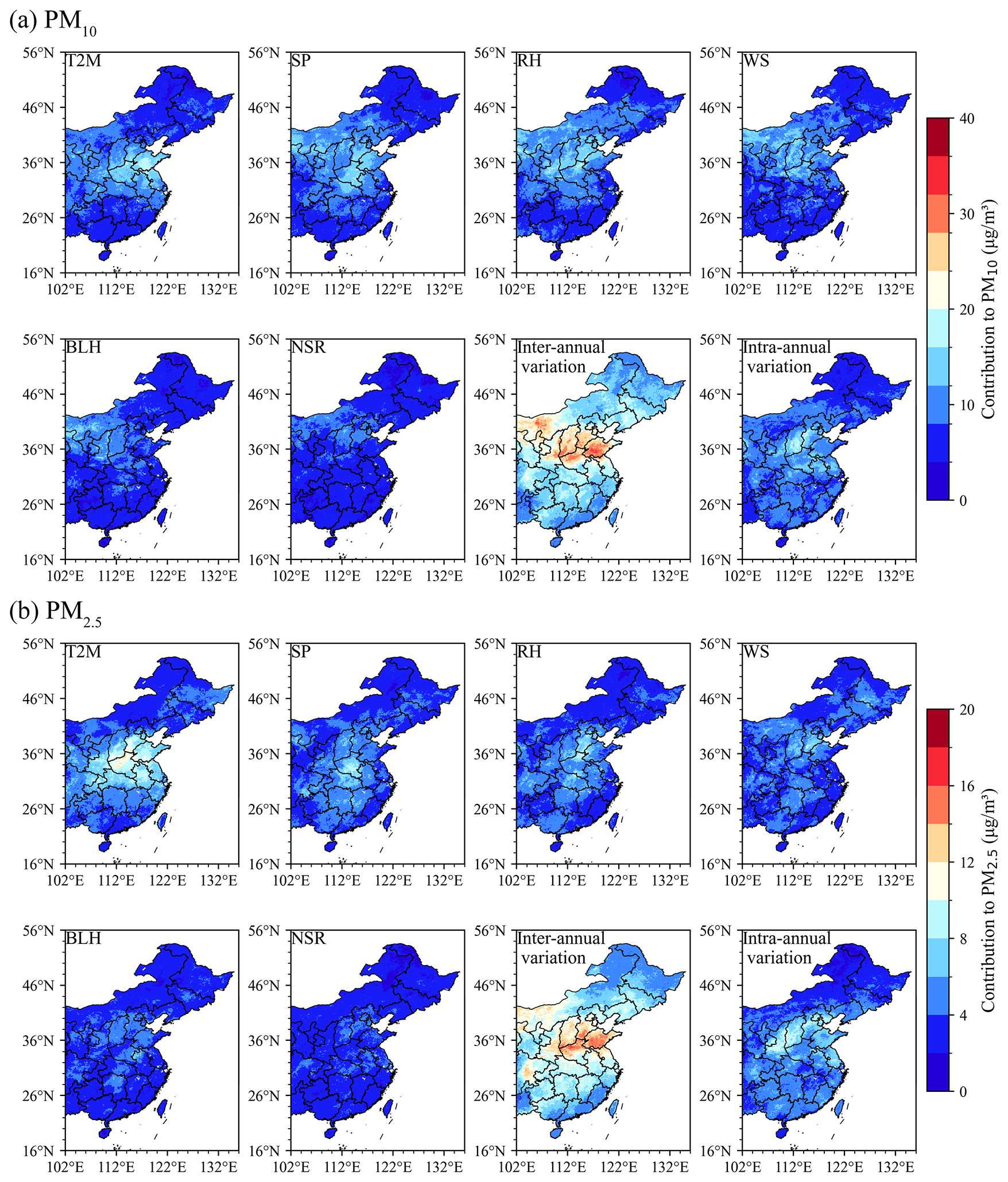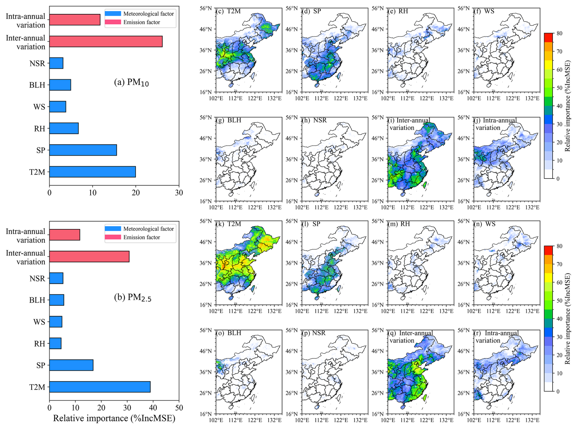Figure 5Spatial distribution of the relative influence of each variable on PM pollution. In panels (a)(b), the red variables are related to emissions and the blue variables are related to meteorology.
