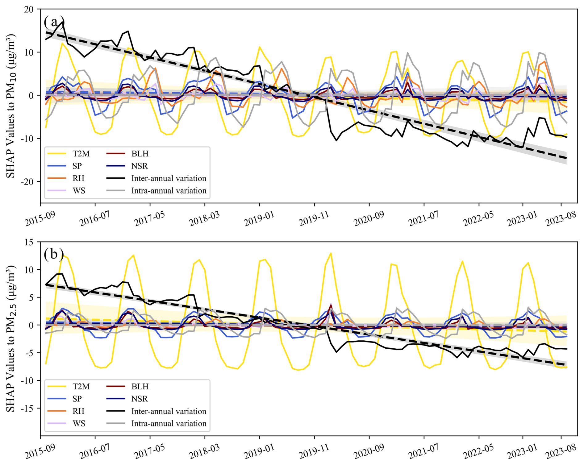 To further investigate the influence of potential driving factors on PM concentrations, we conducted a detailed analysis of the trends in the contributions of each variable was performed. As shown in Figs. S10–S13, the monthly trends in the relative contributions and SHAP values of each variable were examined, categorized into significant changes (p< 0.05) and non-significant changes (p>0.05). For the relative contributions (including PM10 and PM2.5), with the exception of interannual variations, all other variables showed a decreasing trend, although some regions showed an increasing trend. However, the contribution of interannual variability showed a significant decrease, indicating a reduced capacity of anthropogenic emissions to trigger PM pollution events. This phenomenon is more pronounced for the trends in SHAP values. In particular, only the contribution of interannual variations showed a significant decreasing trend, while the other variables showed non-significant decreasing trends, mainly due to the periodic variations in their contributions, as shown in Fig. 7. This shows that the impact of a variable on PM pollution cannot only be assessed on the basis of its relative contribution, but its positive or negative influence on the improvement of PM pollution must also be considered.